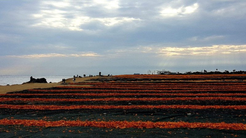 이번에는친구와 함께 바람도 쐴 겸, 또 하나의 겨울 풍경을 보러 표선 바다로 향했다. 허리를 다쳐 한동안 꼼짝을 못 한 친구에게 문득 오렌지와 블루가 만들어내는 칼라의 이중주를 들려주고 싶었다. 겨울이 오면 때를 기다렸다는 듯이 신천리 바다목장은 강렬한 오렌지 빛으로 뒤덮인다. 햇살 좋고 바람 부는 날이면, 어김없이 5만여 평의 목장지에 한약재와 화장품의 원료로 쓰인다는 귤피가 가득 널리기 때문이다. 날이 맑아 바다까지 시퍼레지면 블루와 오렌지 칼라의 대비는 더욱 선명해지며 보기 드문 진풍경을 연출한다.
