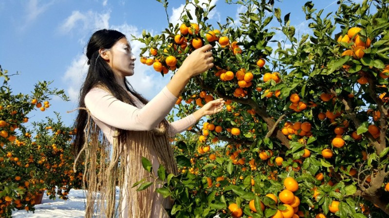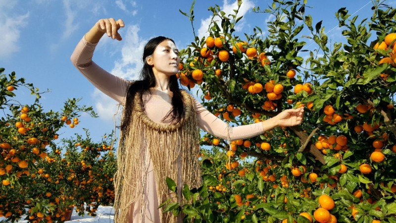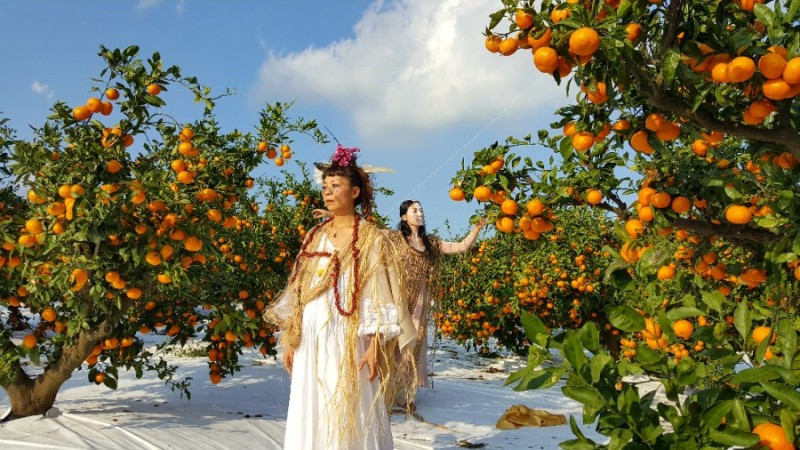 실험예술제 첫날, 드릇팟 아트 퍼포먼스에서 그녀가 자신의 무대로 점지한 곳은 서귀포 농업기술센터 바람의 언덕에 자리한 귤밭이었다. 11월이면제주도는귤이 한창인지라 나무마다 탐스럽게 익어가고 있었다. 아, 그런데 귤나무는 분명 결실의 계절 가을이 분명한데, 감귤을 피워내는 대지는 마치 눈이라도 내린 듯 하얀 겨울 느낌이 아닌가? 이는 농업기술센터에서 시험재배를 하며 귤의 당도를 높이기 위해 하얀 필름지 타이벡을 바닥에 깔아 놓았기 때문이었다. 그곳은 현실과 비현실의 경계가 무너지며 초현실적인 세계가 펼쳐 치고 있었다. 그곳을 무대로 선택한 그녀의 안목이 새삼 놀라웠다.