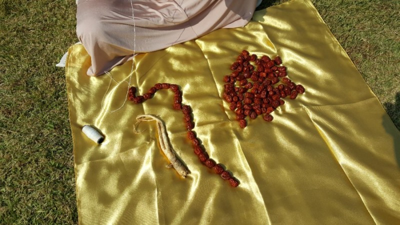 그녀는 귤나무 그늘 아래 앉아 있었다. 그녀 앞에 펼쳐진 황금빛 보자기에는 대추 수십 알과 커다란 도라지 한 뿌리가 놓여 있었다. 그녀는 십여 개의 대추가 꿰어진 실에 바늘로 한 알 한 알 대추를 엮으면서 퍼포먼스를 시작하였다. 그 모습은 주변의 초현실적인 배경으로 인해 마치 선녀가 내려와 앉은 듯한 착각을 불러일으켰다. 가을인지 겨울인지 도통 계절을 분간할 수 없는 곳에서 이루어지고 있는 예술행위가 너무나 환상적이어서 나는 잠시도 눈을 뗄 수가 없었다.