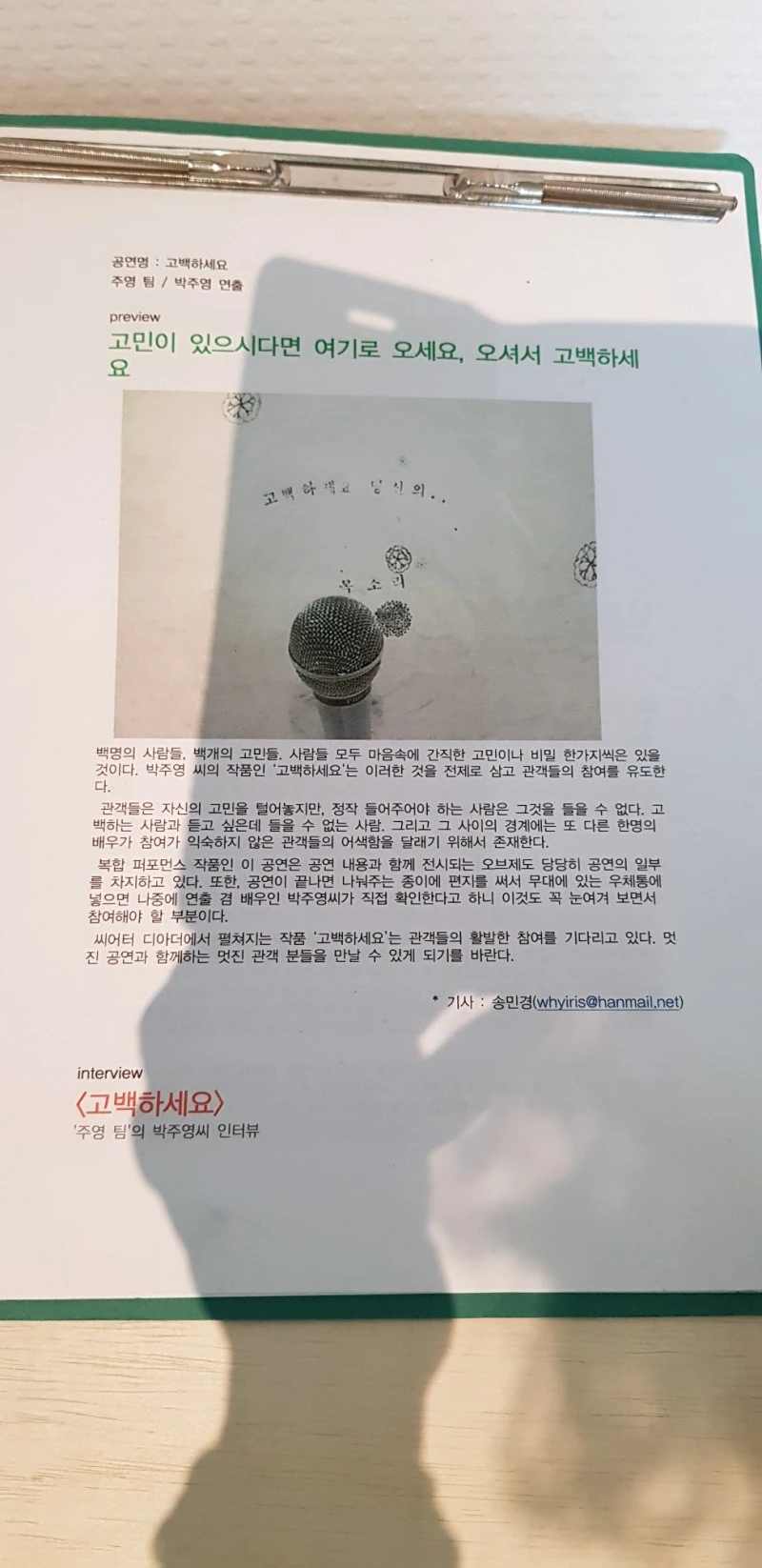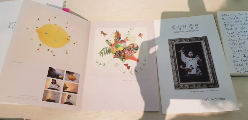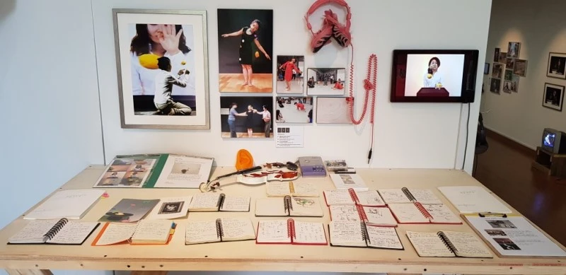다음 날박주영 작가는 두 번째 공연을 이어갔다. 나는 제주 현대미술관 전시장에 마련된 그녀의 전시 코너를 먼저 찾았다. 과거의 공연 사진과 함께 테이블 위에는 여러 권의 수첩이 전시되어 있었다. 잘 들리지 않을 때마다 소통을 위해 필담을 나눈 수첩에는 그녀의 행위예술 역사가 담겨 있었다. 눈물겨운 노력과 열정이 쌓이고 쌓여 오늘의 작가 박주영이 만들어진 것이다. 감동도 잠시, 나는 곧이어 시작되는 2층 공연을 위해 전시장 감상을 마무리하고 계단을 올랐다.