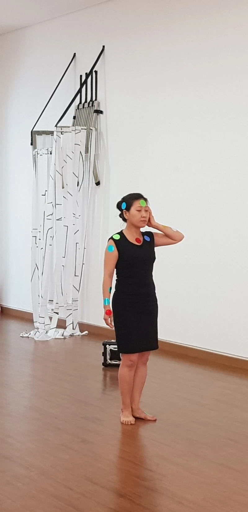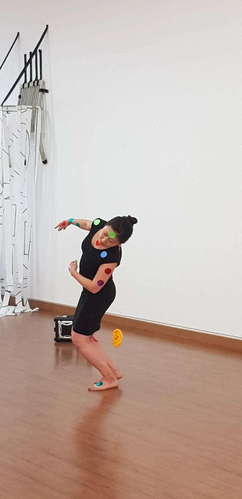 녹음기에선 박주영 작가 어머니의 육성이 흘러나왔다. 단어와 짧은 문장으로 이어진 소리들이 낭랑하게 울려 퍼졌다. 스티커를 받은 관객들이 일어나 그녀의 몸에 스티커를 붙였다. 나는 그녀의 손을 잡고 손목에 스티커를 붙여 주었다. 그녀의 몸 곳곳에 알록달록한 동그란 무늬가 생겼다. 그것은 그녀의 소리에 대한 열망처럼 부풀며 온몸으로 번져 나갔다. 성인이 되어서야 인공 고막을 달게 된 그녀에게 소리는 실타래처럼 끊임없이 이어졌다. 언어는 홍수를 이루며 흘러넘쳤다.