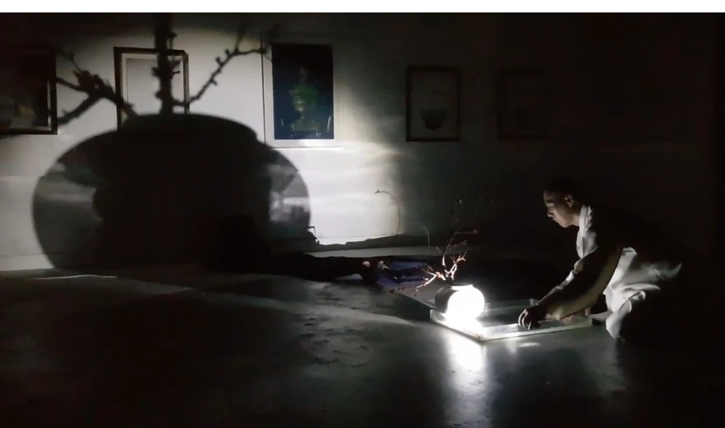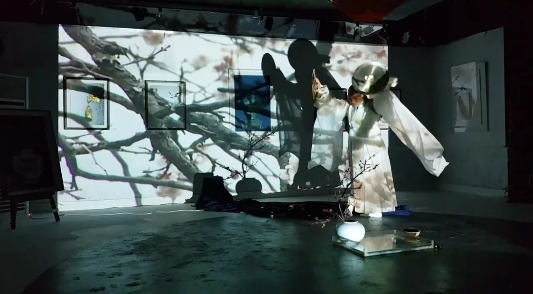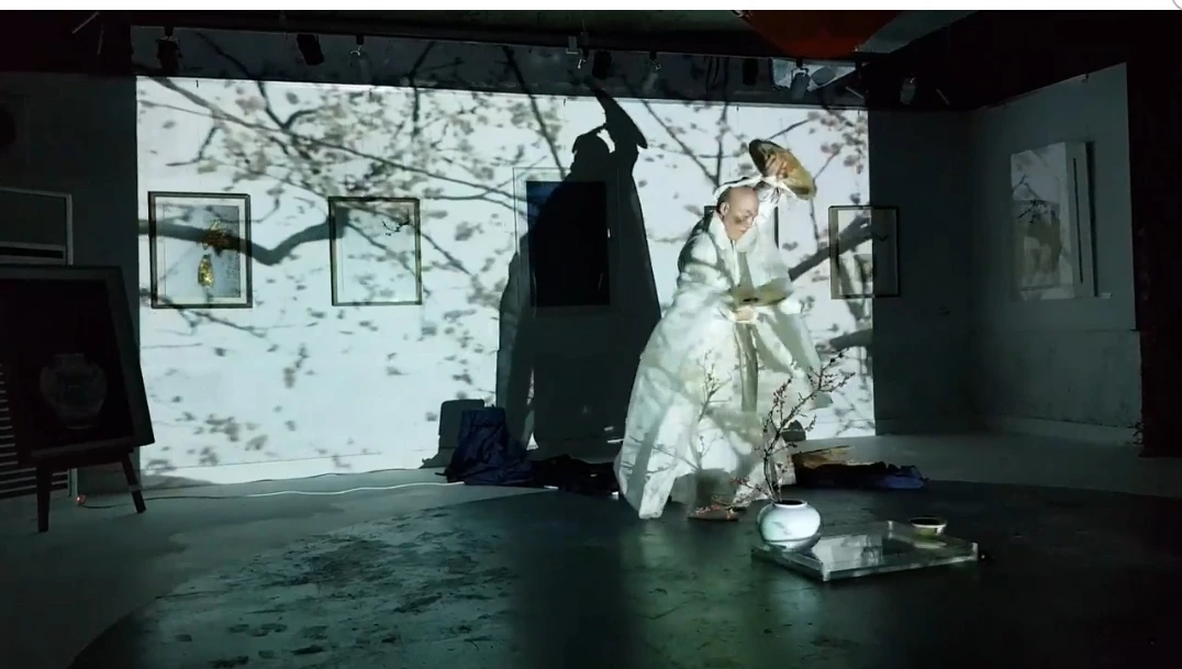 관객은 다 함께 달밤의 꽃놀이로 초대되었다. 곳곳에서 꽃망울이 터져 나왔다. 어느새 서빳 공간은 매화향으로 가득 채워지는 듯하였다. 마음은 달떠서 바람 따라 춤을 추었다. 손전등 하나로 방안의 매화가지를 비추어내며 유유자적 그림자놀이의 삼매경에 빠져 있던 작가는, 이제 버선발을 들어 올리고 도포 자락을 휘날리며 바라춤을 추었다. 매화향을 따라 두둥실 구름처럼 노닐었다. 그것은 인생을 달관하며 즐기는 신선의 세계였다. 또한 육체를 떠난 영혼의 자유로운 몸짓이었다. 그는 순간이나마 매향 따라 이 꽃 저 꽃을 날아다니는 나비가 되었는지도 모르겠다.인간이 다다를 수 있는 최고의 경지,달항아리처럼 완벽하고 충만한 홀로 있음이었다. 나도 모르게 아! 나지막이 탄성이 터져 나왔다. 이토록 격조 있는 놀이는 금시초문이었다.