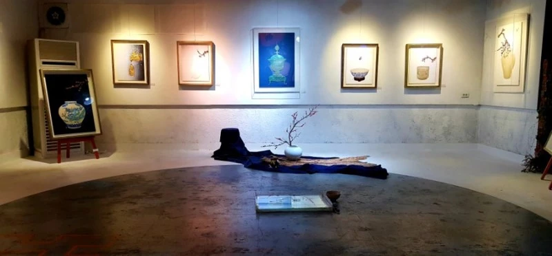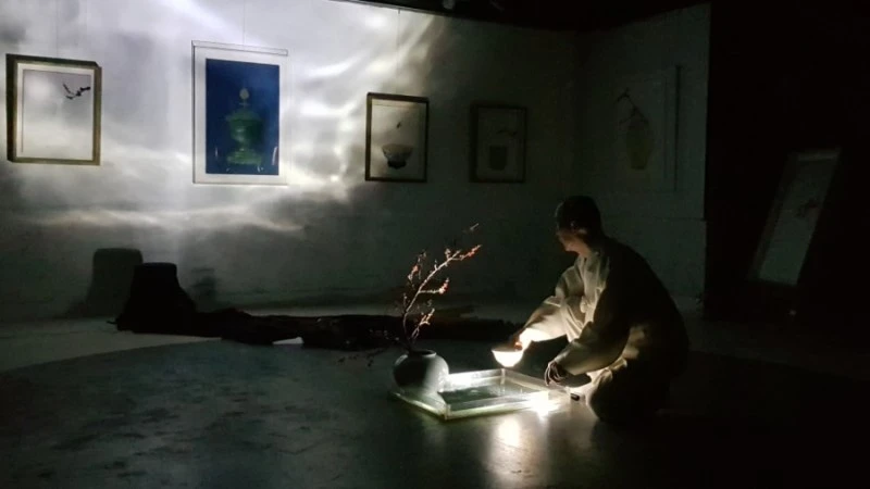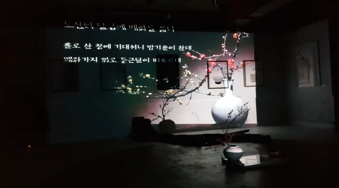전시 첫날이어서 작가 소개 뒤에 오프닝 퍼포먼스가 이어졌다. 전시 작가가 스스로 오프닝 무대를 마련한 경우는 처음이었다. 그토록 다재다능한 예술인은 드물었기에 더욱 호기심이 일었다. 무대에는 제주를 상징하는 한라산의 조형물이 멋지게 마련되어 있었다. 불이 꺼지고 은근한 조명 아래로 또르르 찻잔에 물을 따르는 소리가잔잔히 울려 퍼졌다. 서서히 물 무늬가 바닥을 타고 흐르며 벽으로 번져 올랐다. 벽면에는 보름달처럼 풍만한 달항아리가 등장했고, 다들 오매불망 기다리던 매화가지가천정에서 선녀처럼 사뿐히내려앉았다. 달항아리의 담박함과 매화의 고매한 품격이 썩 잘 어우러졌다.