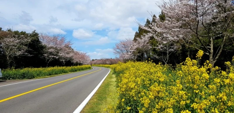 시간을 더하는 마을, 서귀포의 가시리(加時里)에는 10km를 내리 달릴 수 있는 꽃길이 있다.`녹산로’라 불리는 이 길은 조선시대 최고의 목마장이던 녹산장과 갑마장을 관통하던 길이다. 최근에는 유채꽃을 소재로 한 축제가 열리기 시작하면서 봄철 행락객들의 사랑을 한 몸에 받고 있는 곳이다. 이맘때쯤 이 길에 들어서면, 나는 언제나 가슴이 설레다 못해 쿵쾅거리곤 한다. 유채가 줄지어 피어난 이십 리 길 따라 벚나무가 다정하게 화답하는 환상의 하모니를상상해보라! 하늘이 파랗게 펼쳐지고 뭉게구름까지 두둥실 떠오른 날엔 굽이친 길 끝에서 풍력 바람개비까지 돌아가며 완벽에 가까운 천상의 꽃길이 완성되는 것이다.