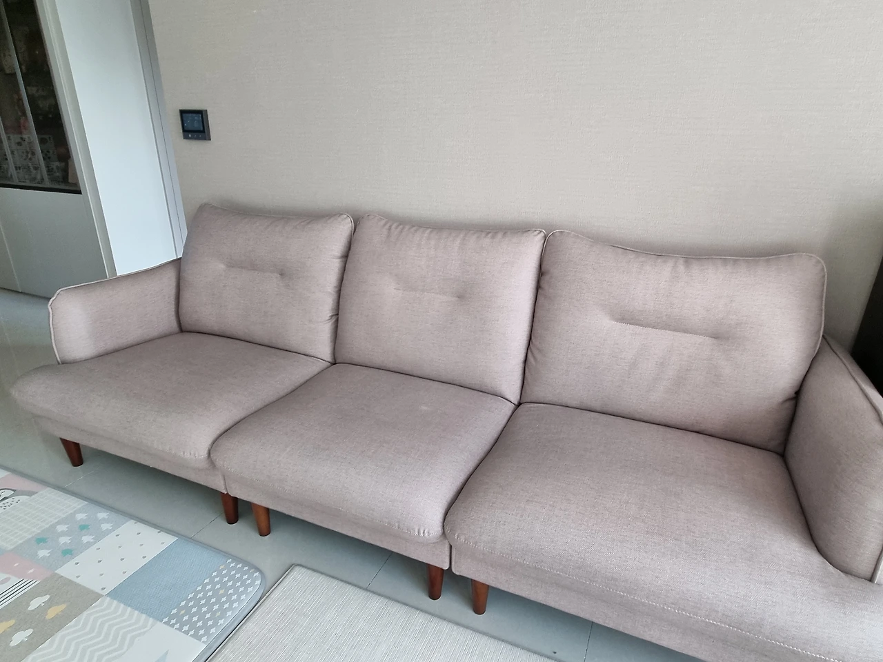 짜자잔. 그래서 소개합니다. 우리 집 NEW 소파를!이 소파로 말할 것 같으면 독일 Taibotex 소재를 사용해 생활방수와 스크래치에 강하고, 부드러운 촉감을 자랑한다. 실제로 설치기사님이 오셔서 땀을 많이 흘리시는 바람에 소파 곳곳에 땀방울이 조금 튀었는데, 흡수되지 않고 맺혀있어 휴지로 톡톡 닦아내니 흔적도 없이 사라졌다. 며칠 후 딸아이가 볼펜으로 그은 흔적도 알코올솜으로 톡톡 두드려주니 없어졌다.