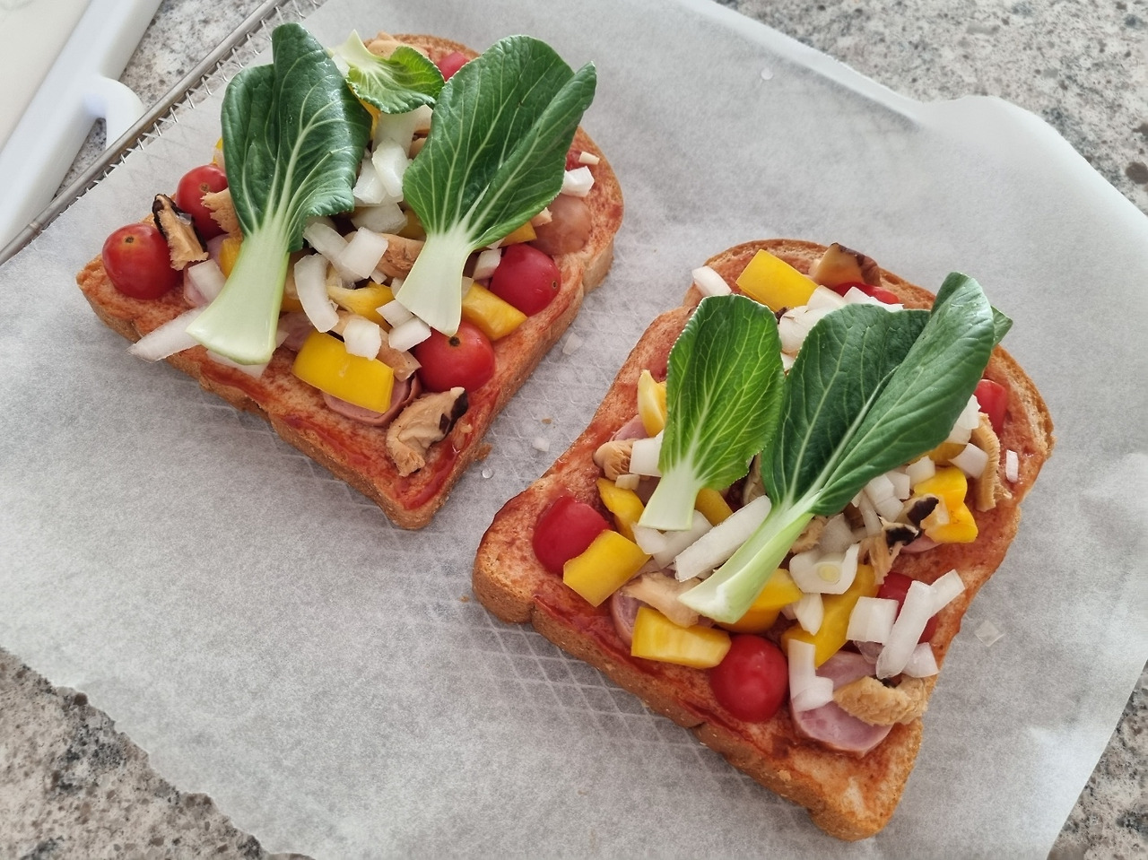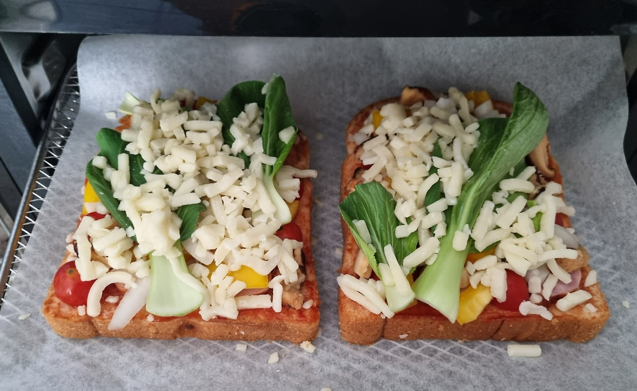 빨간 옷을 입은 식빵 위로 먼저 소시지를 올리고, 사이사이 토마토를 올린다. 파프리카를 올리고, 표고버섯도 구석구석 알맞게 넣어준다. 솔솔 양파를 뿌리고, 청경채도 얌전히 올려본다. 재료 구성도 내 마음대로, 양도 내 마음대로, 올리는 모양도 내 마음대로다. 갈수록 손이 커져서 요즘에는 재료를 듬뿍 올리게 된다.