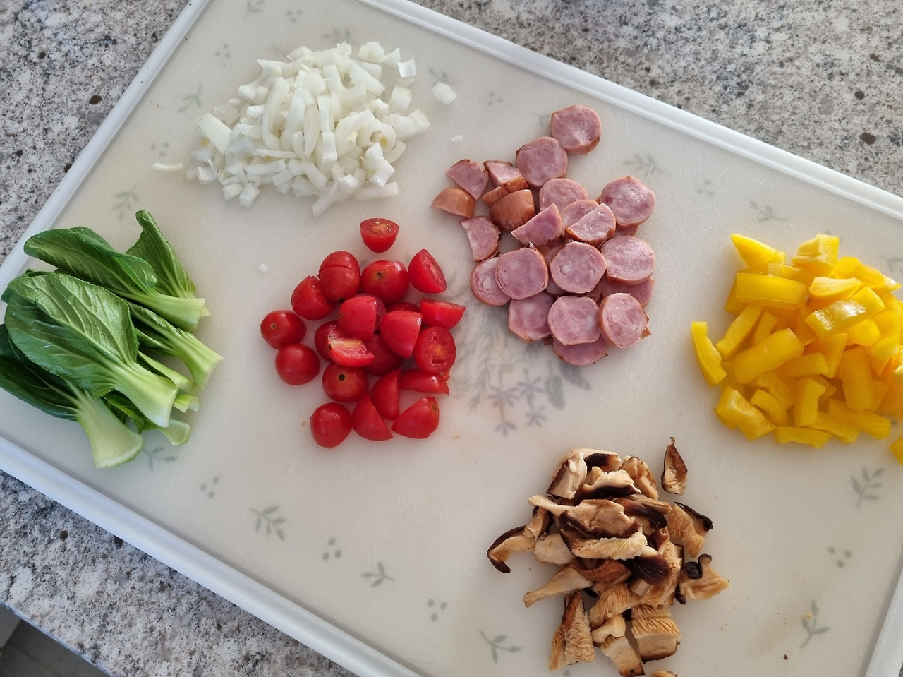 그래서 오랜만에 식빵 피자를 구웠다. 냉장고를 뒤져 집에 있는 재료들을 꺼냈다. 양파, 소시지, 파프리카, 방울토마토를 작게 자르고, 표고채도 물에 불려 적당한 크기로 썰었다. 루꼴라 피자를 떠올리며 집에 있던 청경채도 깨끗이 씻어 손질해 한편에 두었다. 출격 대기 완료!