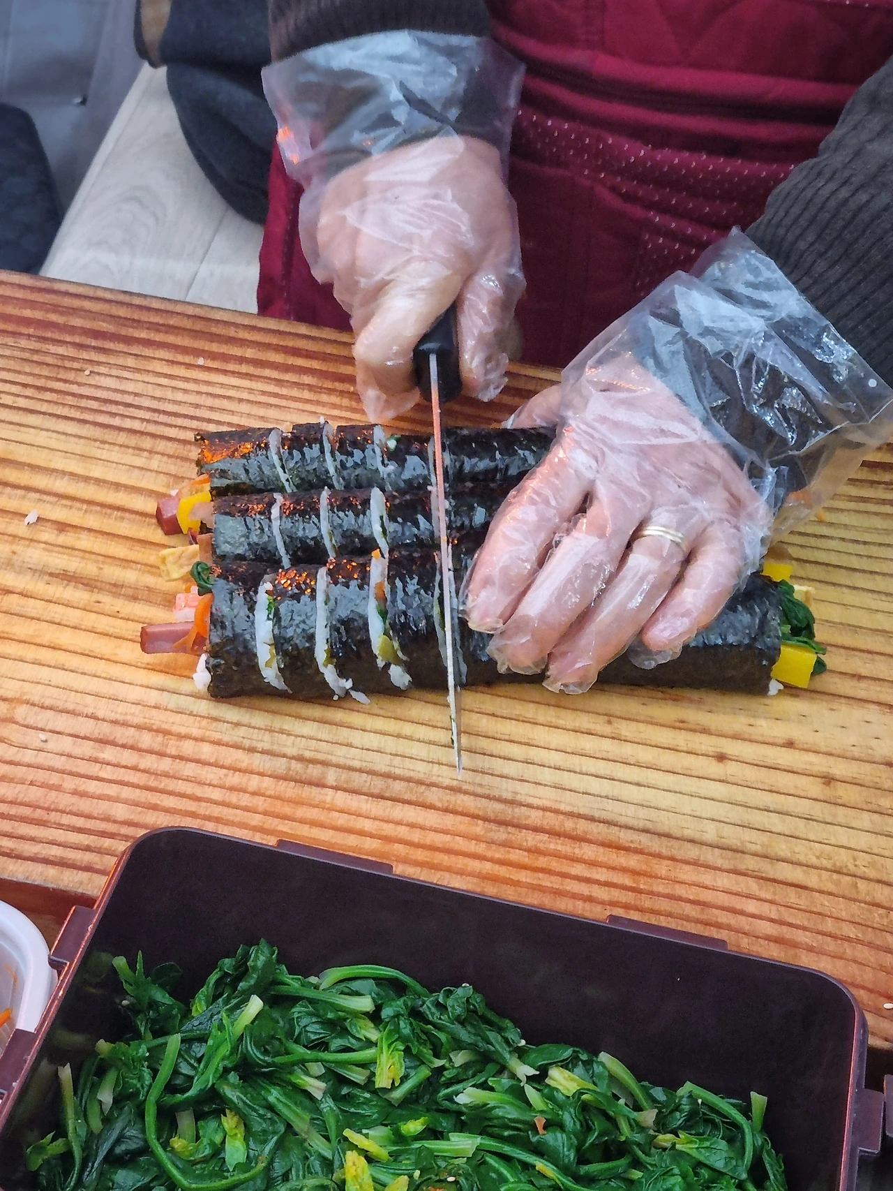 오늘은 국수를 기다리며 맞은편에 있는 김밥집에서 우엉김밥 3줄을 주문했다. 기본 김밥이 1,500원에 우엉김밥은 2,000원. 주문과 동시에 즉석에서 김을 꺼내 뜨끈한 밥을 올려 슥슥 펴고 재료를 올려 김밥을 말아주신다. 먹기 좋은 크기로 김밥을 썰고 은박지에 담아 깨를 솔솔 뿌려주면 완성. 국숫집으로 김밥을 가져와 곁들여 먹어도 된다. 시장의 넉넉한 인심이다.
