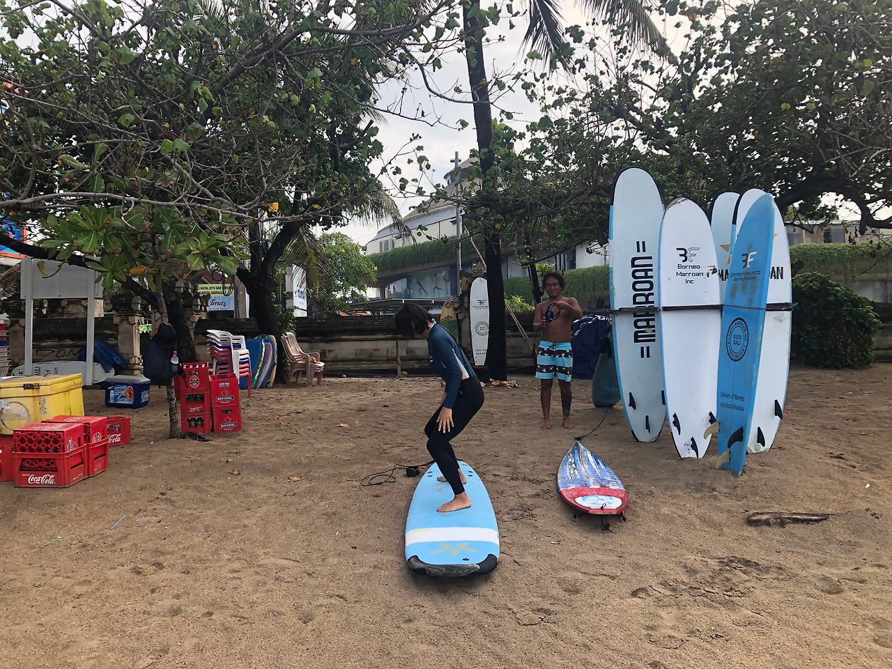 강사가 붙잡아주는 서핑 보드 위에 누워서 균형을 잡고 있다가 적당한 파도가 오면 패들링을 시작하고 보드 위에 일어서야 했다. 그런데 일어서야 하는 순간 서핑보드에서 몸이 떨어지지 않았다. 그래서 바닷물에 풍덩 빠져 파도에 휩쓸렸다. 두 번째로 물에 빠졌을 때는 몸이 보드 아래로 들어갔다. 세 번째는 무릎으로 서기. 네 번째는 서핑 보드에서 몸이 떨어지고, 두 발을 수평으로 놓고 팔을 펴서 서서 균형을 잡아 파도를 즐길 수 있었다.