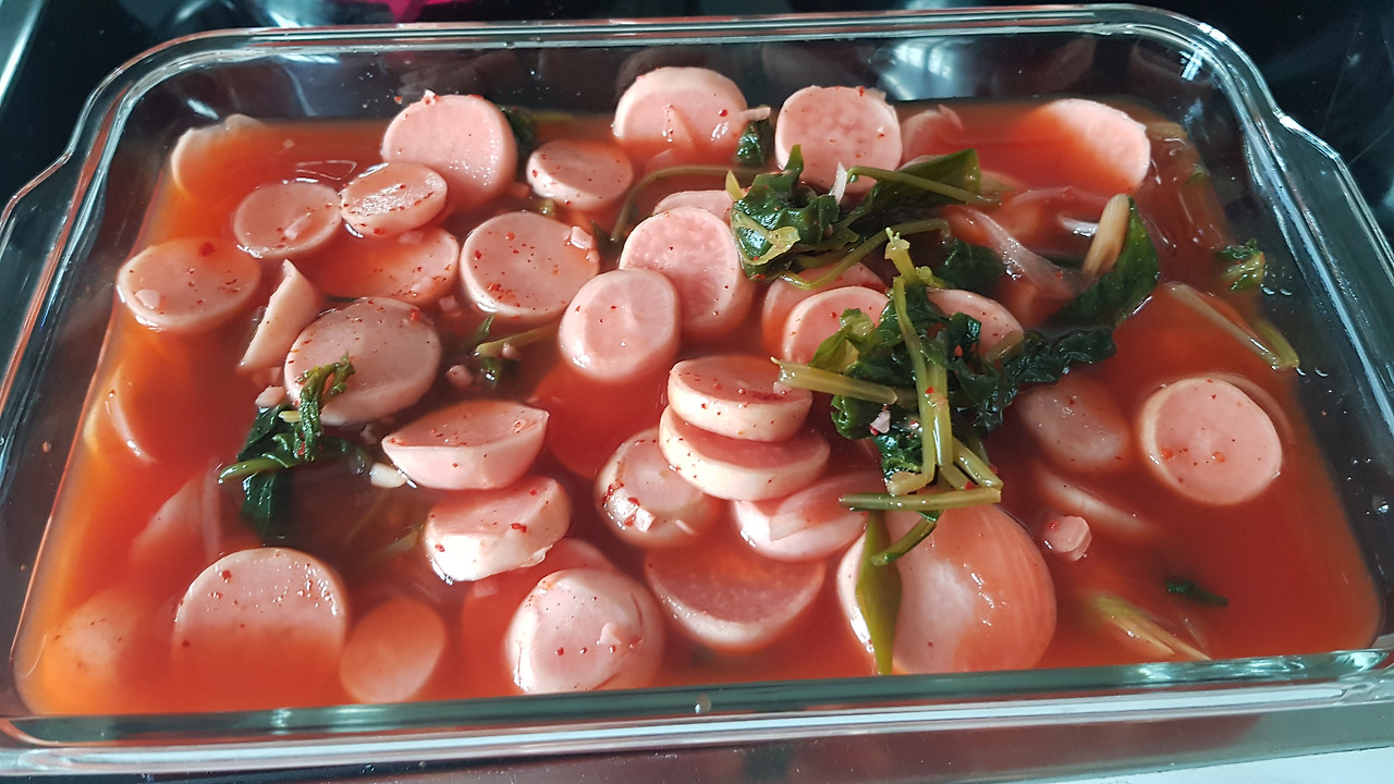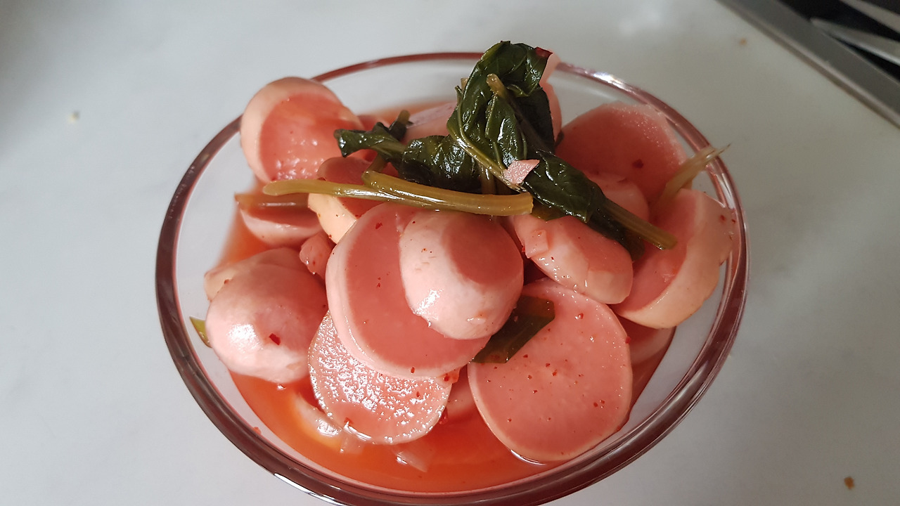 그래서 꿩 대신 닭이라고 이곳 독일에서 봄, 여름이면 너무나 쉽게 구할 수 있는 래디쉬로 김치를 담아먹기 시작했다. 처음엔 반신반의로 일단 담아봤다. 여기 사람들은 래디쉬의 붉은 뿌리 부분만 먹고 초록 이파리는 버린다. 부드럽고 연한 이파리로 충분히 김치가 가능할 것 같았다. 예전 엄마가 물김치를 담는 것을 어깨너머로 보았던 기억을 쫓아 만들어 보았다. 열무로 담은 물김치만은 못하지만, 그럭저럭 먹을 만은 했다. 해서 해마다 이 래디쉬로 물김치를 만들며 '여름 시즌'을 준비한다.