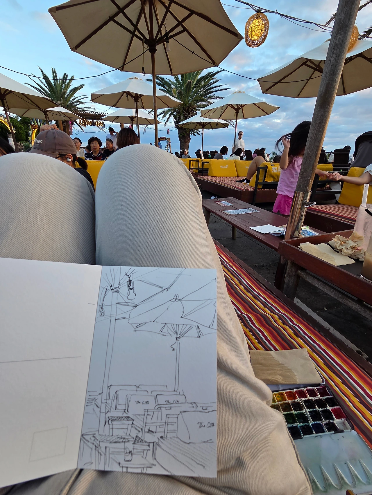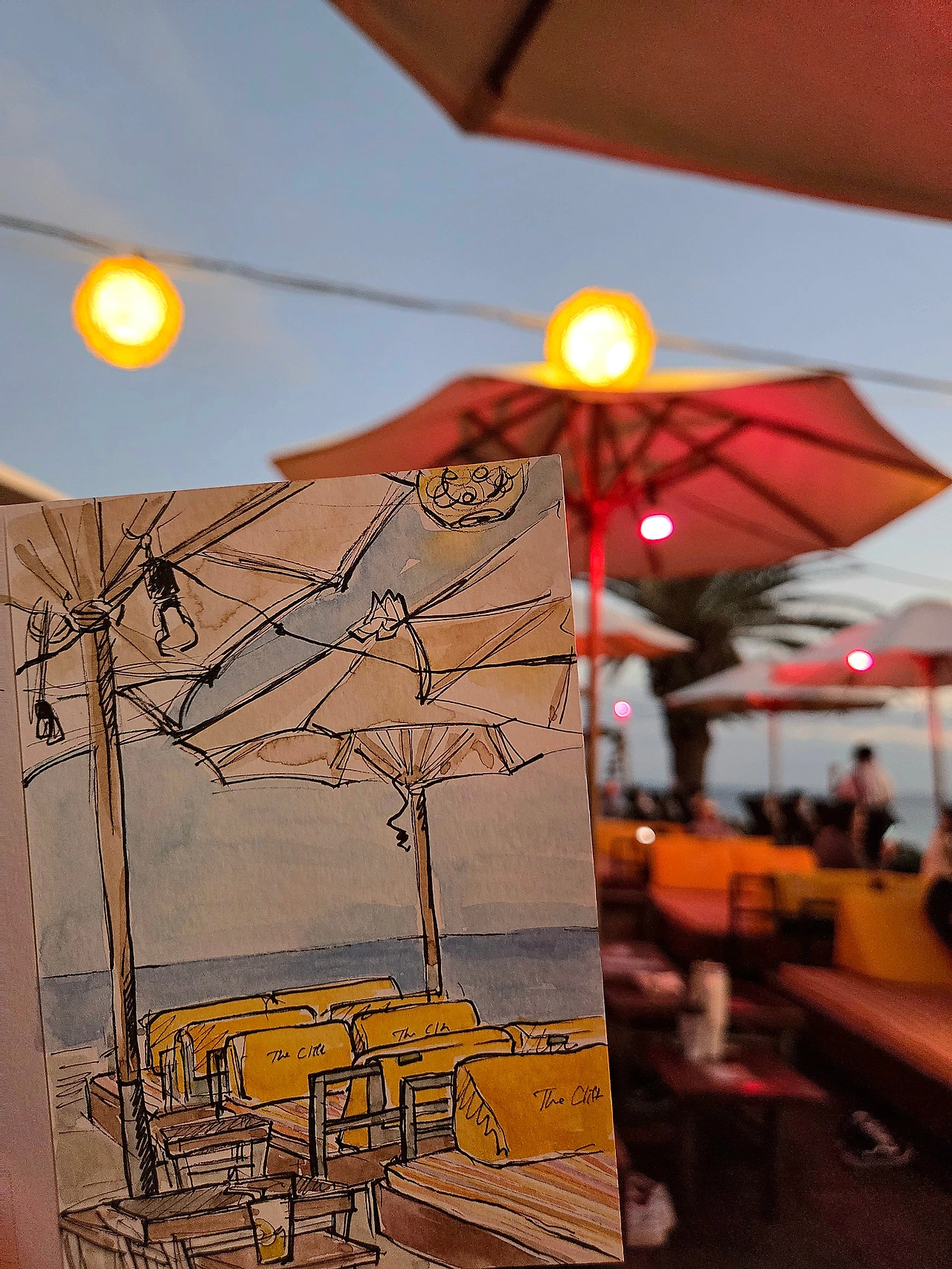 빛에 젖은 파라솔, 사람들의 실루엣, 노을빛이 스며든 의자 하나하나가