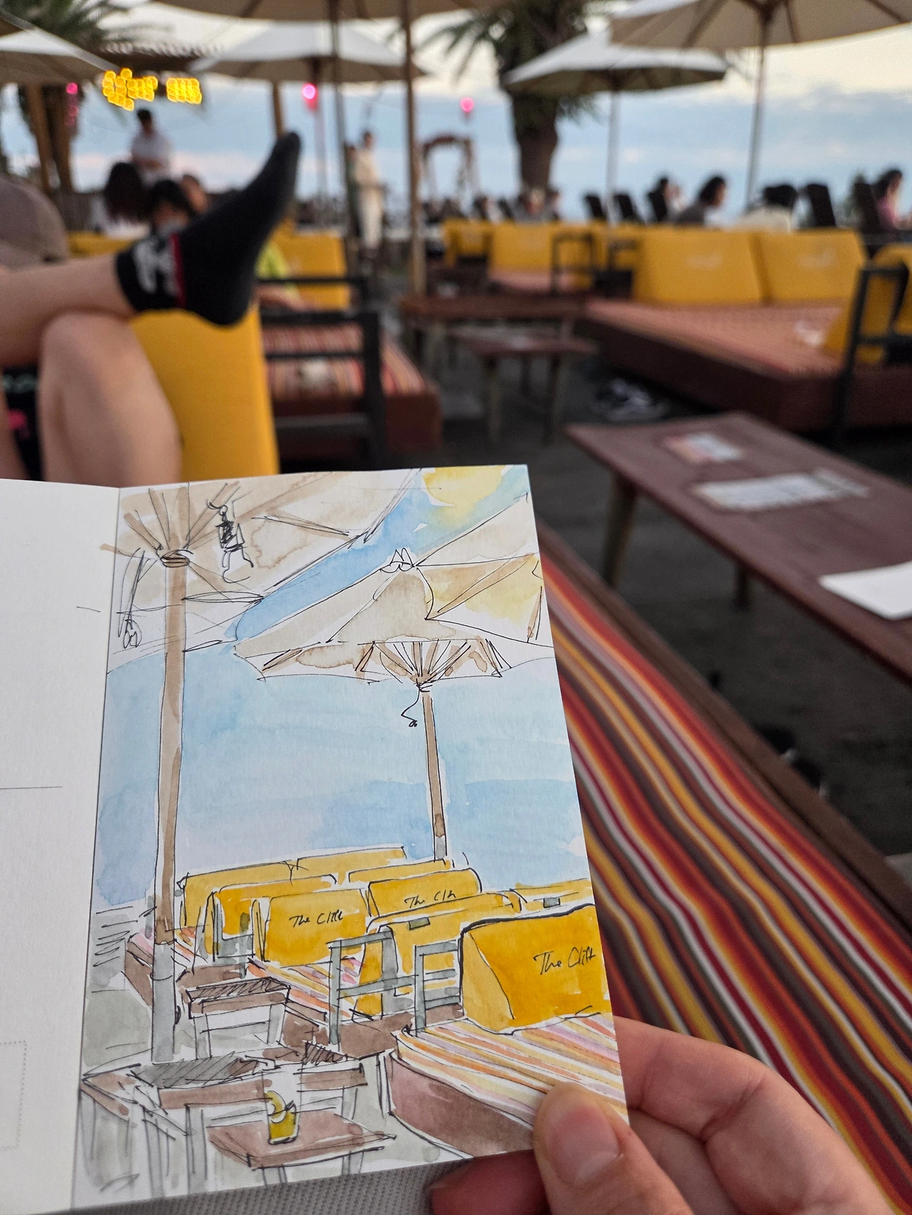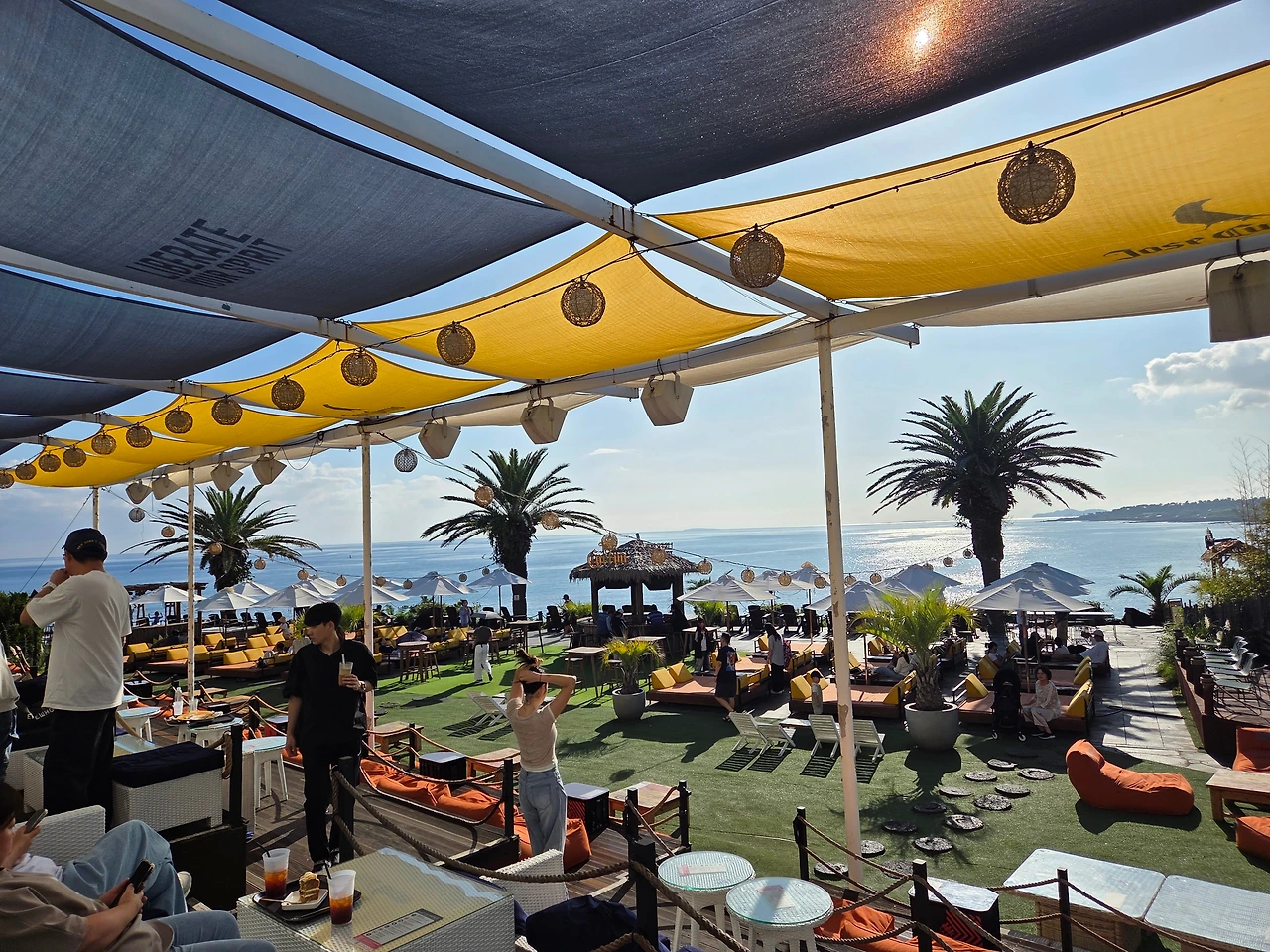 해안가에 있을법한 넓은 침상에 커다란 파라솔 아래 앉으니,