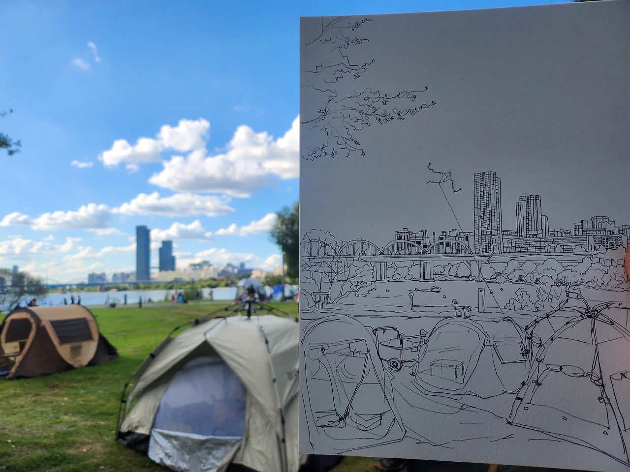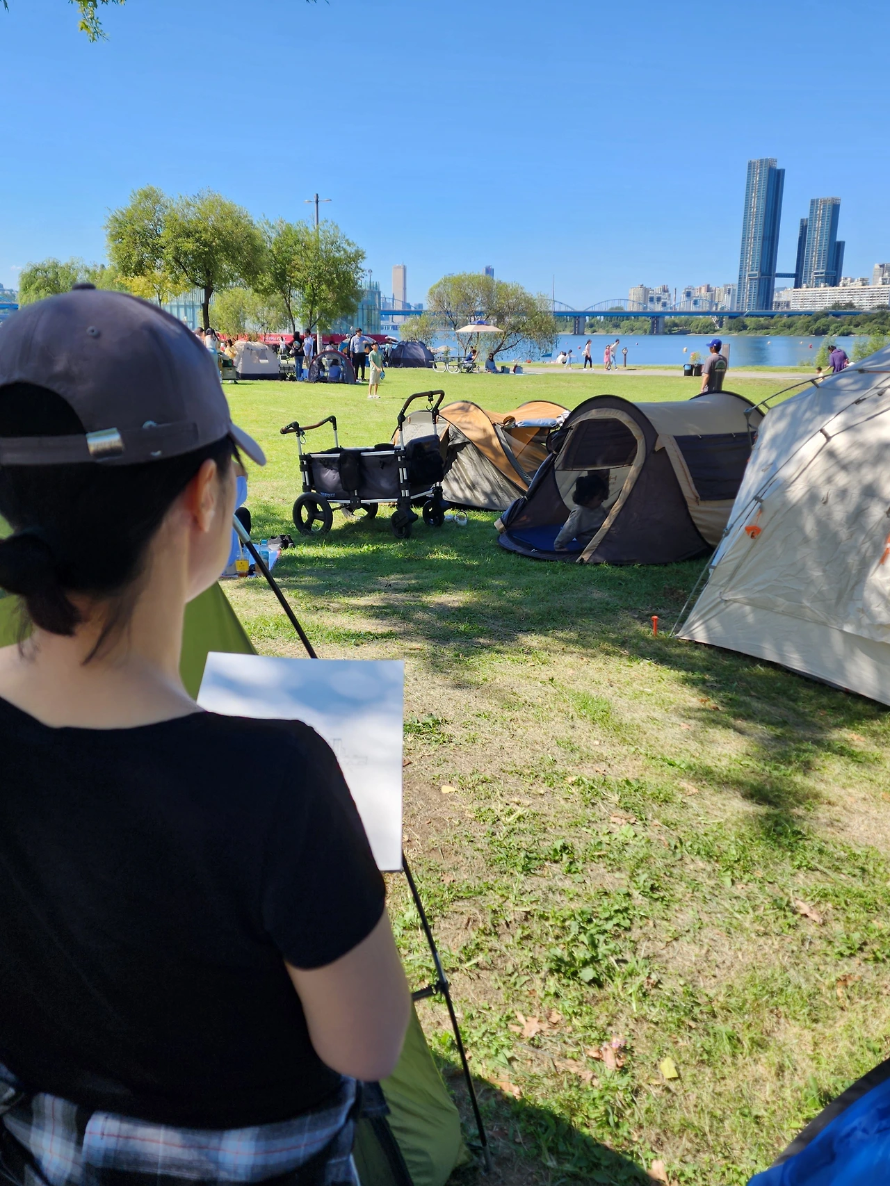 처음엔 의자에 앉아 그리다가 텐트에 가려 보이지 않는 풍경 때문에 일어났습니다.