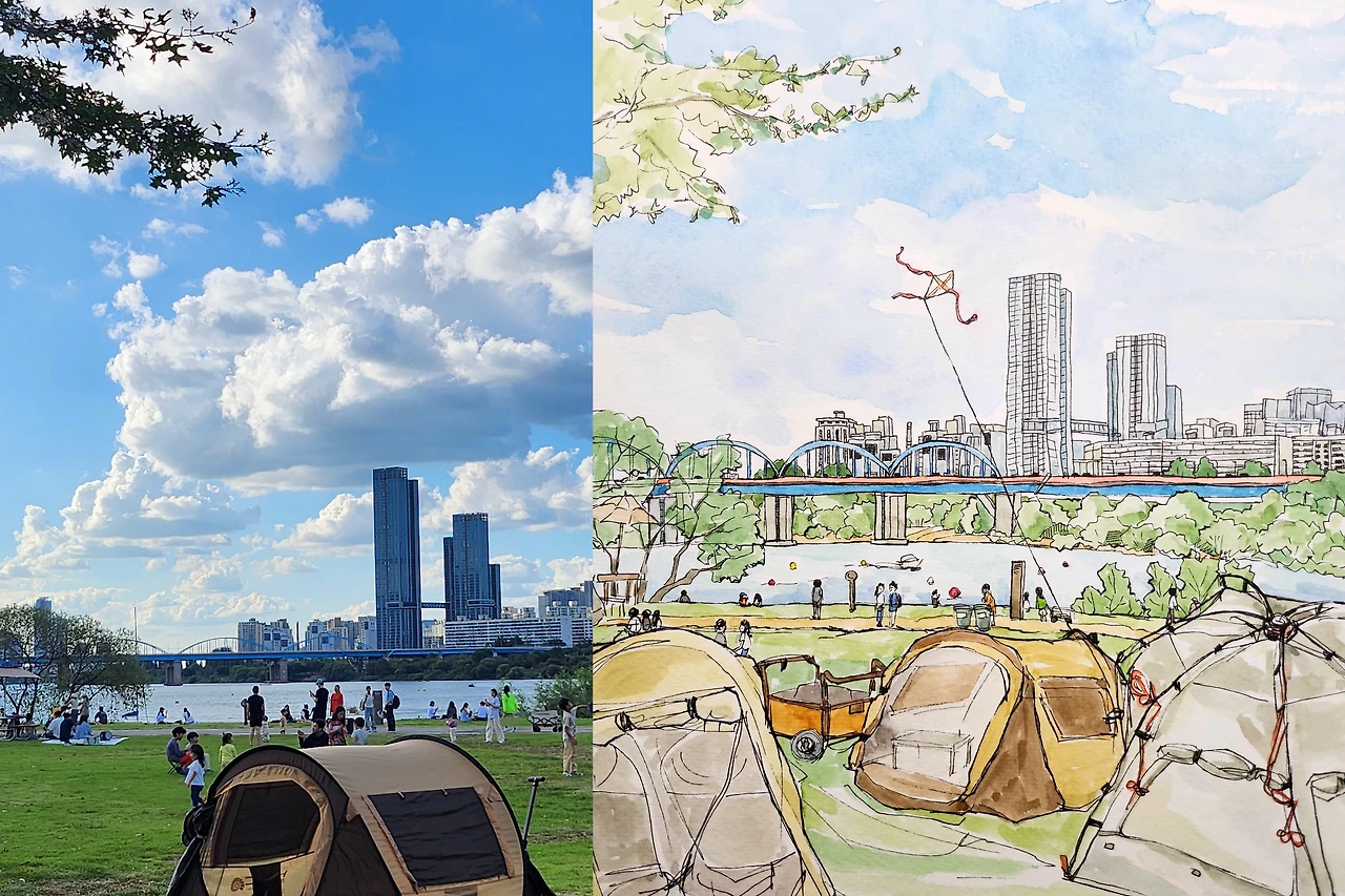 펜을 이리저리 놀리며 한강 저너머 알지 못하는 건물을 그립니다.