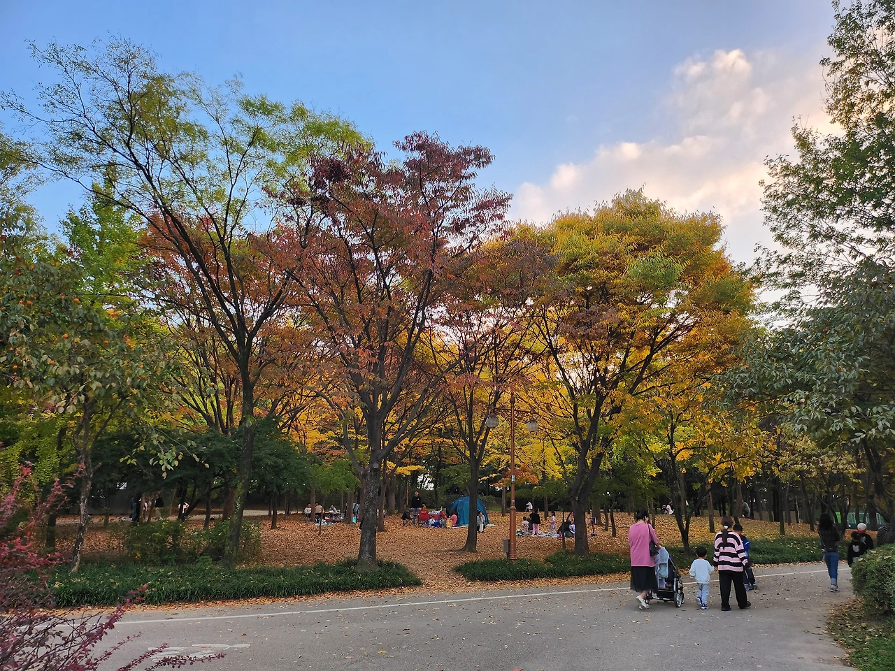 낙엽을 한 움큼 집어 머리 위로 던지는 아가가 바로 앞에 있는 명당자리를 잡고 챙겨간 과자에 매점에서 산 커피를 마시며 한껏 가을을 누려봅니다.
