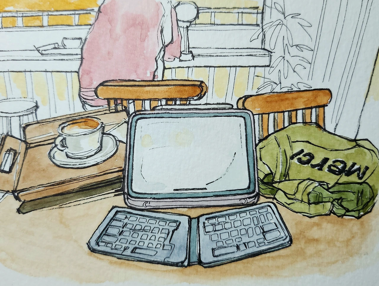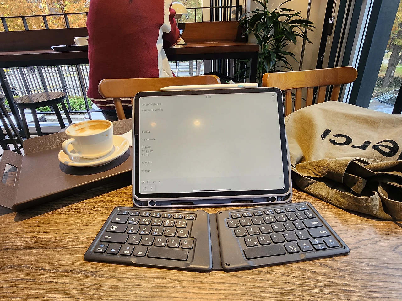 카푸치노 한 모금에 정신을 차리고 패드와 휴대용 키보드를 꺼냈습니다. 최근에 선물 받은 접이식 키보드가 이럴 때 너무나 유용합니다. 처음엔 자판에 익숙하지 않아 조금 버벅 대다기 이내 글쓰기에 몰입합니다.
