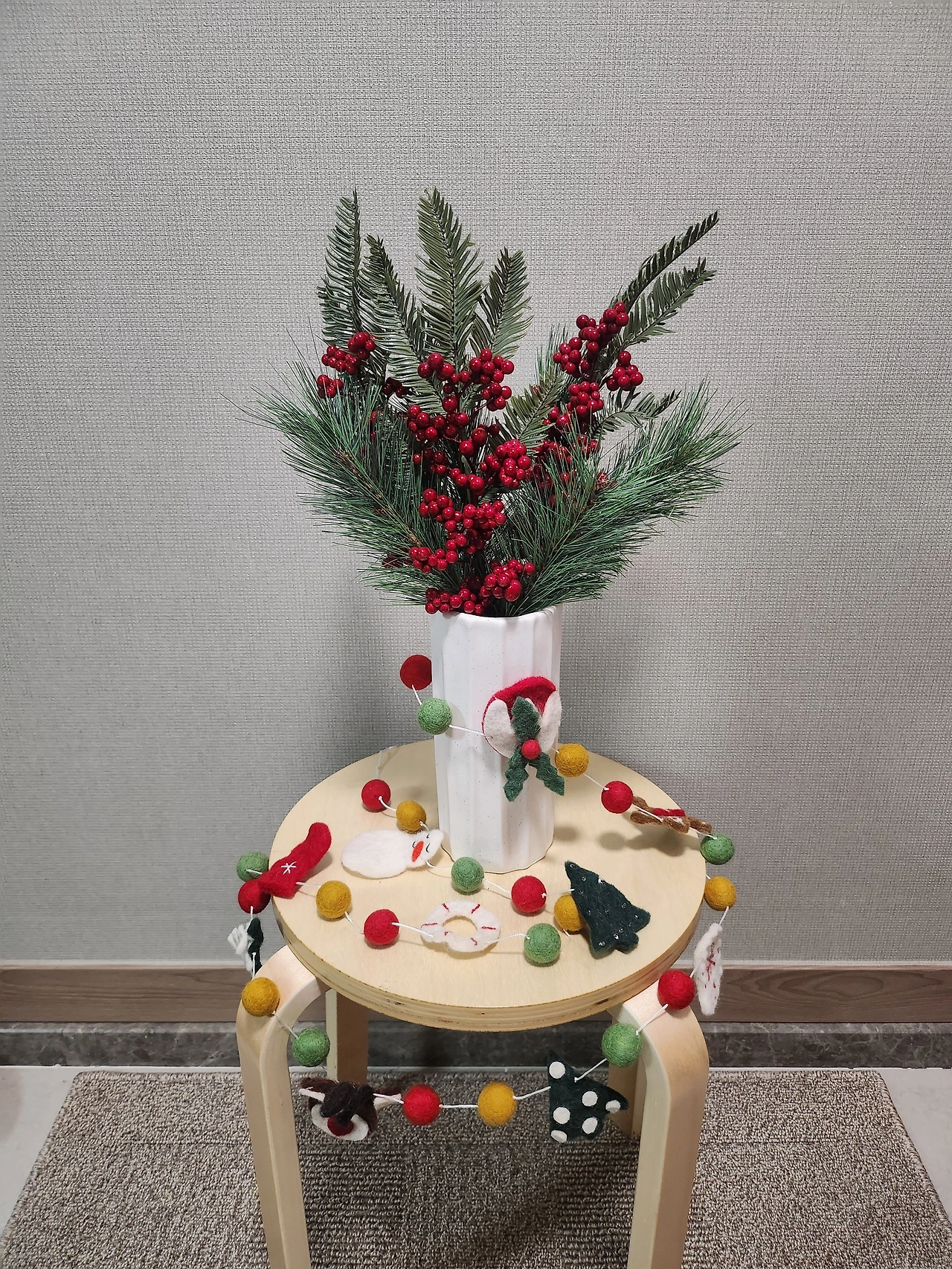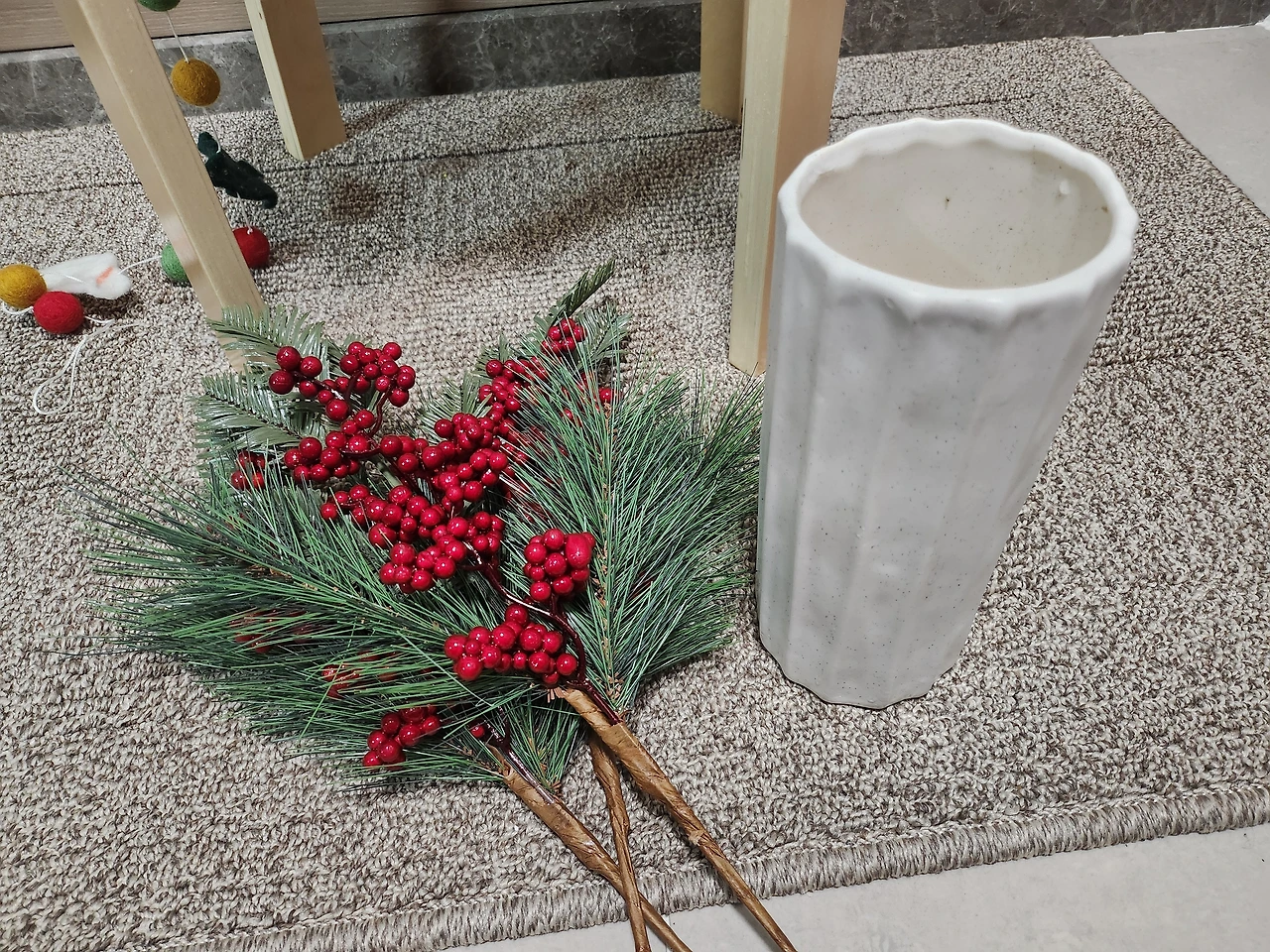 나뭇가지만으로는 허전할 것 같아 작년에 다이소에서 구입한 크리스마스 느낌에 장식도 함께 놓았더니