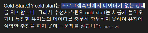 콜드스타트란 서비스에 사용자나 아이템에 대한 정보가 없는 상황을 뜻한다. 신규 서비스를 런칭했을 때, 아무런 사용자 정보가 없으면 협조 필터링을 활용한 추천은 당연히 불가할 것이다. 이 때 서비스측에서 갖고 있는 아이템의 정보를 활용하고, 사용자에게는 명시적으로 아이템에 대한 기호를 직접 입력받는다면 내용 기반 필터링이 조금 더 유리할 수 있다. 하지만 이 또한 완벽하지는 않기 때문에 서비스가 성장해나가면서 알고리즘도 지속적으로 손을 봐야하긴 할 것이다.