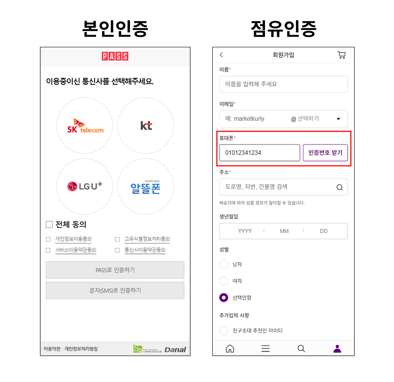 - 휴대폰 본인인증: 본인 명의의 휴대폰 번호로 인증번호를 발송받아 이를 입력해 신원을 확인하는 방식