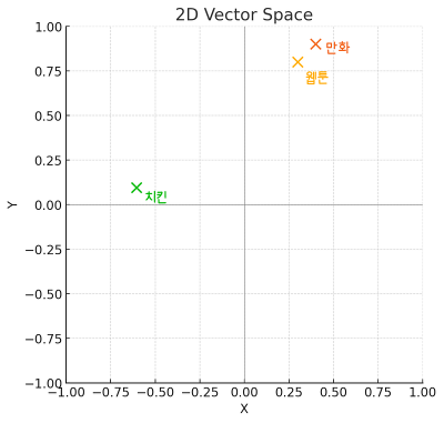2차원 평면에 이 벡터들을 찍어보면, ‘웹툰’과 ‘만화’는 가까이 있고 ‘치킨’은 아예 다른 방향에 있다. 모델은 이 간격과 방향을 보고, 두 개가 비슷한지 아닌지를 판단한다.