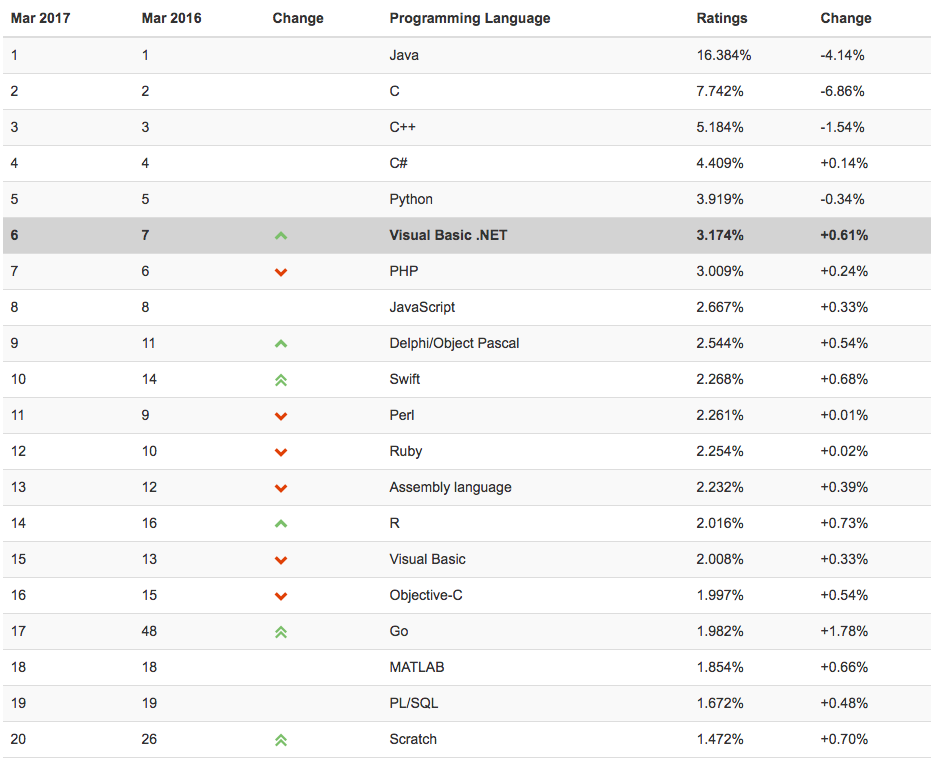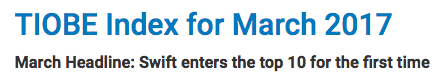 스위프트 10위권 집입, Objective-C 16위...