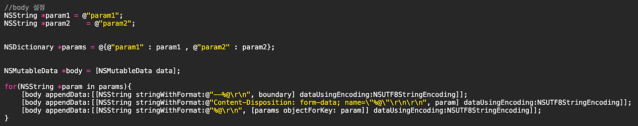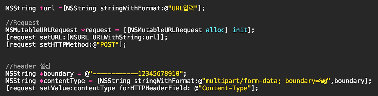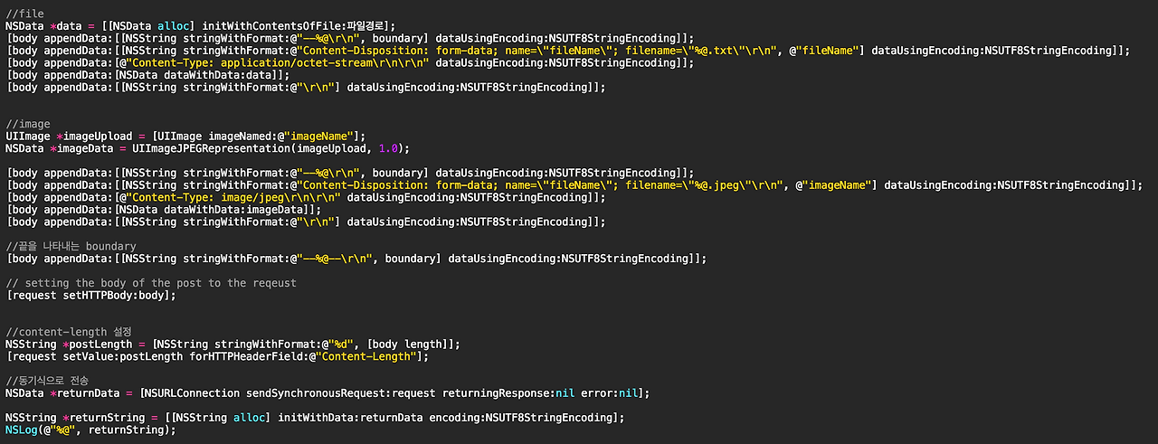 name=\"%@\"은 실제 폼의 이름을 나타내고, 바로 밑에 데이터를 넣고 boundary로 구분해 줍니다.