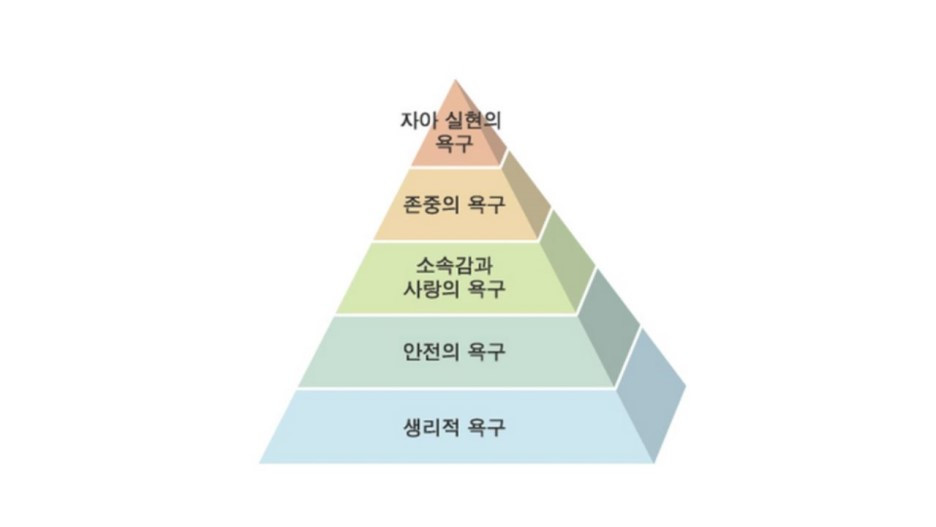 그동안 학교에서 열심히 암기했던 매슬로우 욕구 5단계 이론은 1. 생리적 욕구, 2. 안전의 욕구, 3. 소속감과 사랑의 욕구, 4. 존중의 욕구, 5. 자아실현의 욕구가 있다. 우리의 목표는 최상위 단계인 자아실현을 통한 욕구를 얻는 것이다.