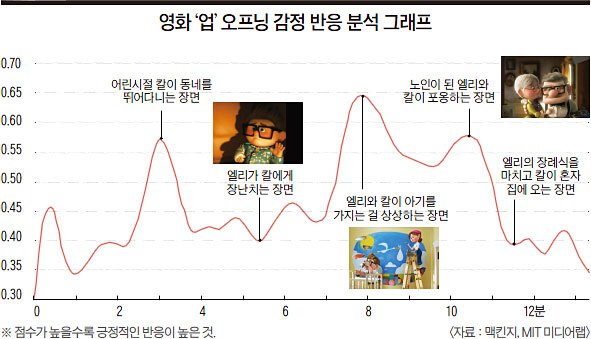 이 분석에 따르면 ‘업’의 오프닝에서 긍정적인 감정 반응이 가장 높게 나타난 순간은 칼과 엘리가 아기를 가지고 싶어 하는 장면이었다. 이때 관객들의 감정 반응 점수는 0.65점에 가까웠다. 이후 엘리가 아기를 가질 수 없다는 사실을 알게 되면서 부정적인 감정 반응이 늘었다가 칼과 엘리가 늙은 이후에도 서로를 안아주며 격려하는 장면에서 다시 긍정적인 감정 반응이 증가했다. 오프닝의 마지막 즈음에서 엘리가 죽고 칼이 혼자 집으로 돌아오는 순간에 부정적인 감정 반응이 가장 크게 늘었다. 불과 1분도 안 되는 순간에 0.57점에서 0.39점 정도로 점수가 뚝 떨어졌다.