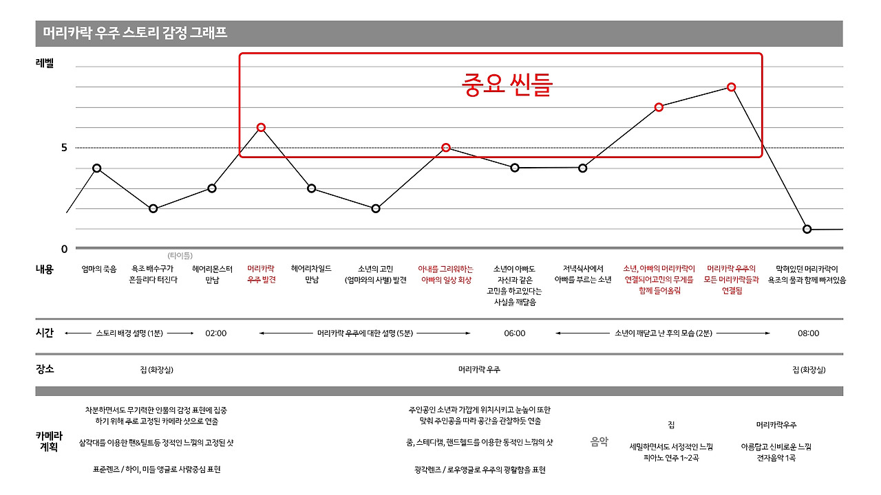 위의 이미지는 작품을 처음 기획할 때, 스토리의 전반적인 흐름을 이해하기 위해 감정 그래프를 그려보았던 이미지다. 감정 그래프를 그려보면서 어떤 씬이 중요하고, 어떤 순간에 관객의 감정이 고조되면 좋을지 한눈에 파악할 수 있었다. 자신이 쓴 이야기라도 머릿속에서 한 번에 정리되지 않는 경우가 많기 때문에, 다양한 방법으로 스토리를 접근하고 분석하면서 더 깊게 이해하기 위한 시간을 가졌다.