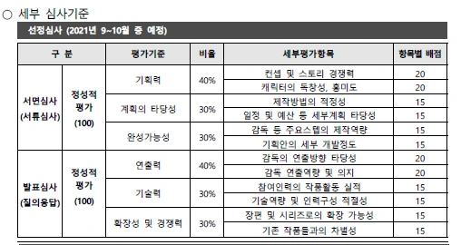내 생각에 자료들을 많이 준비하면 준비할수록 좋지만 준비기간이 짧다면 산업진흥원에 나온 세부심사기준을 보고 그 기준에 맞춰 프레젠테이션을 제작하는 것이 효율적이라 생각한다. 어차피 지원사업에서는 애니메이션 지원작이 가진 어느 항목의 특히 특출 난 것보다는 세부평가항목에 맞춰 심사위원이 정량적으로 점수를 내고 항목의 합이 높은 점수의 작품이 지원받는다. 그렇기에 내가 유리한 평가항목보다는 부족한 부분을 더 집중해 최대한 점수를 가져가기 위한 발표자료를 만들었고 예선심사를 통과하였다.