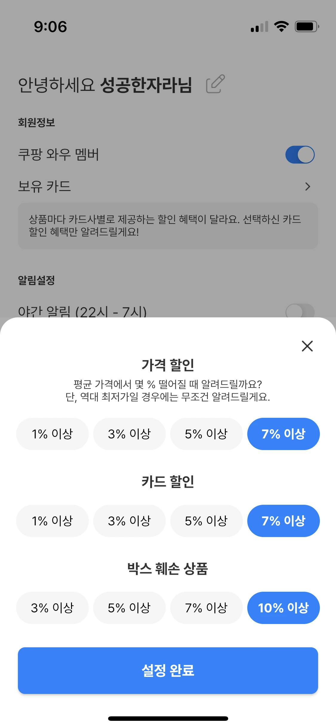 쿠팡 와우 회원 여부, 보유 중인 카드 종류 여부, 반품 상품 선호 여부 등 내 상황에 따라 알림을 상세하게 설정할 수 있다.