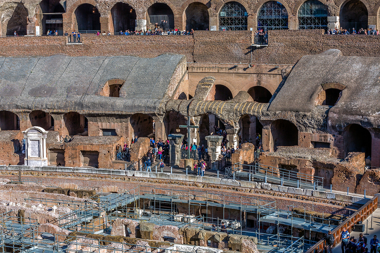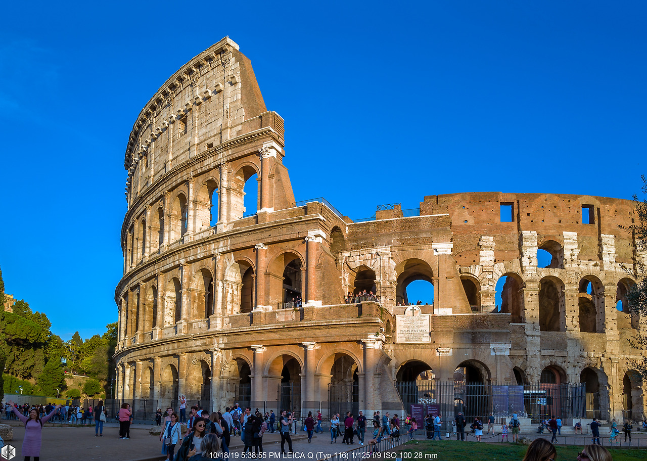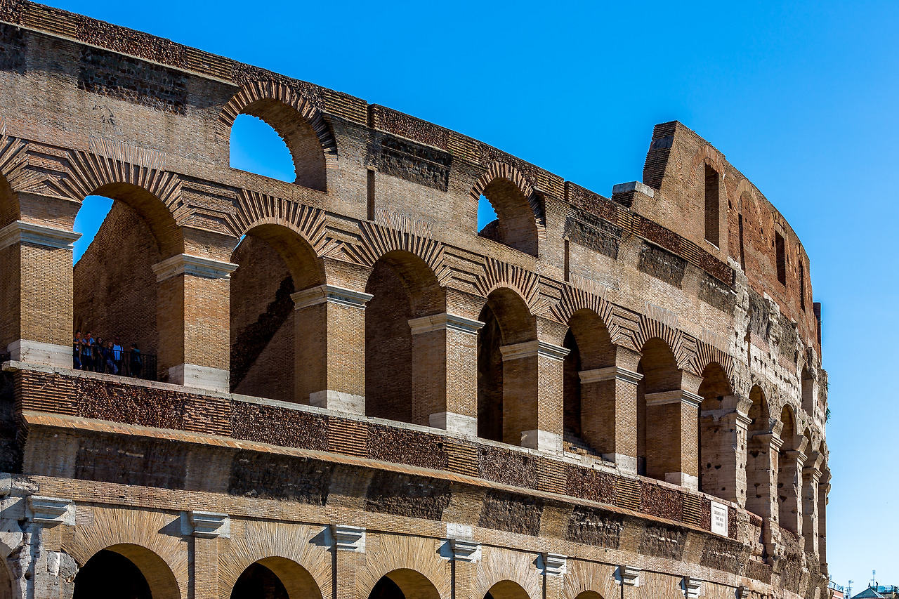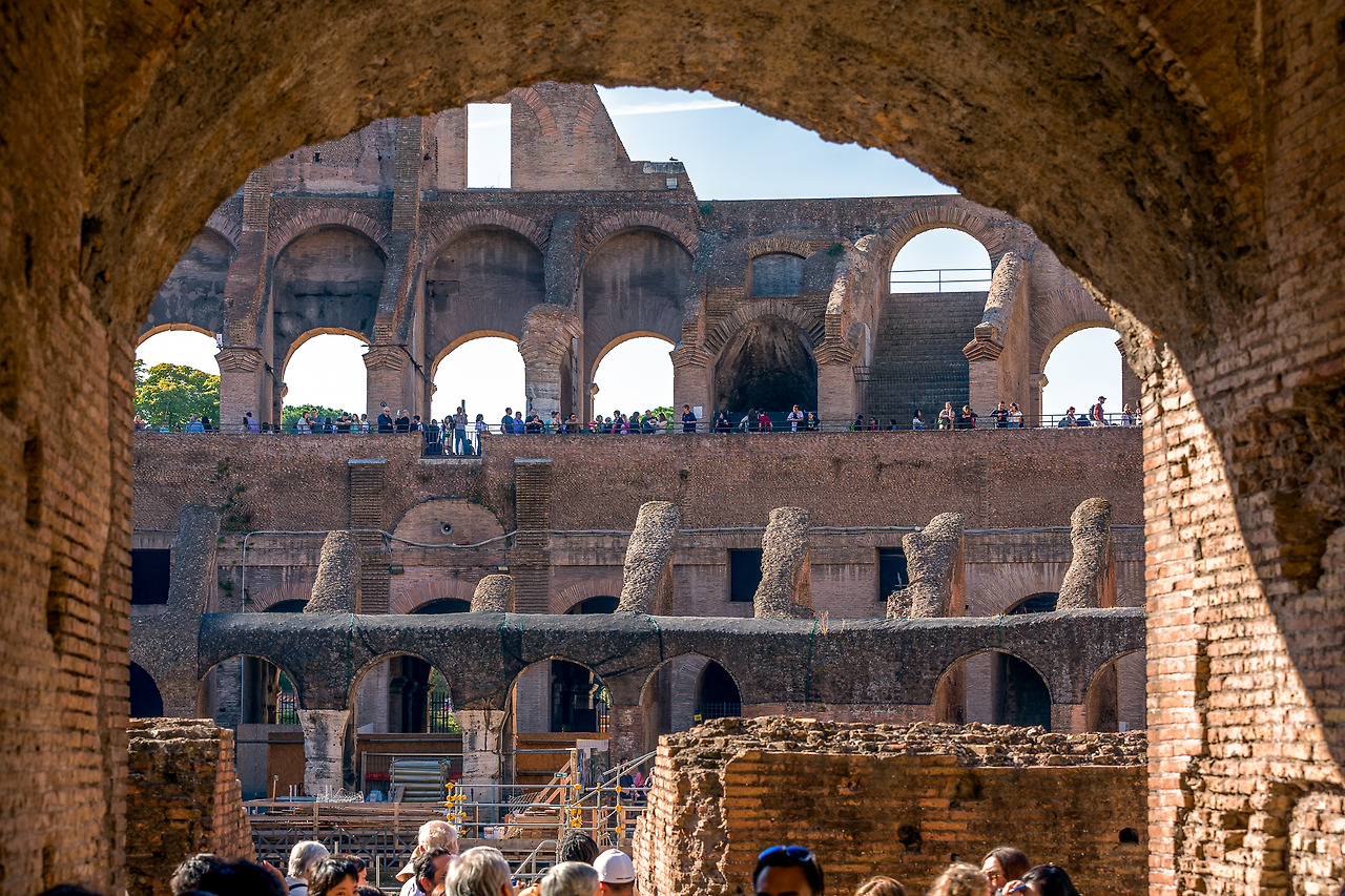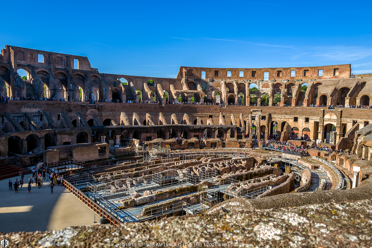 평균 6만5천 명 규모의 육상 및 수상 경기가 가능한 원형경기장 콜로세움. 상암 월드컵 경기장이 66,000석 정도니까 비슷한 규모. 각 층마다 80개 총 320개의 아치가 있어 30분이면 전체 인원이 한꺼번에 들어가거나 나올 수 있도록 설계한 아치 건축의 정수. 아치는 기원전 2500년 인더스 문명에서 최초로 사용되었지만 콜로세움 공사하면서 주인을 제대로 만난다. 역시 가진 자가 주인이 아니라 쓰는 자가 주인. 억울하지 않으려면 아끼지 말고 많이 써야 한다. 물론 가끔 관절이나 와인처럼 아낄수록 가치가 올라가는 것이 있기는 하다. 하지만 그것도 너무 아끼면 ㄸㅗㅇ되는 것은 마찬가지.
