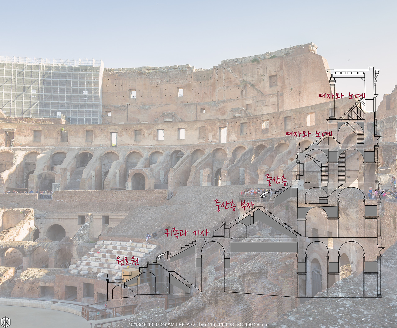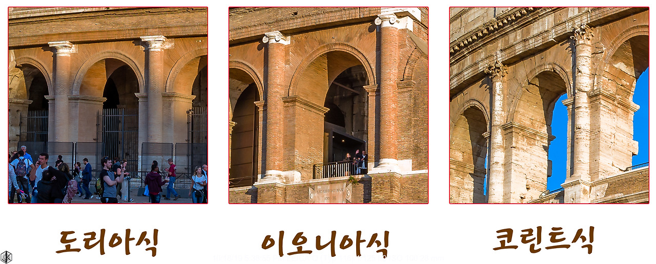 사진을 확대하여 살펴보면 쉽게 알아볼 수 있다. 고교시절 세계사 수업 시간에는 별로 알고 싶지도 않더니 여행 가서 이렇게 모아놓고 비교해 보고 있다. 4층 처마엔 햇빛 가림 차양막을 펼치는 기둥을 지탱하던 홈이 보인다. 로마인들은 참으로 다양한 시도를 했다. 그 시절 차양막이라니. ^^