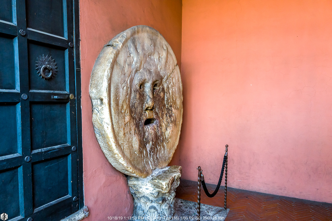 헤라클레스 신전의 하수도 뚜껑으로 쓰였을 거라고 추측되는 대리석 가면 조각이다. 중세 시대에 '거짓말을 한 자는 이 조각의 입에 손을 넣어서 잘려도 좋다'라는 서약을 한 데에서 진실의 입이라고 불렸다. 벽 뒷면에 손을 자르는 사람이 도끼를 들고 서 있었다는 설도 있는데 중세시대라면 충분히 그러고도 남았지 싶다. 그 시대에 태어나지 않은 것에 감사드리며 오후 일정을 준비한다. ^^