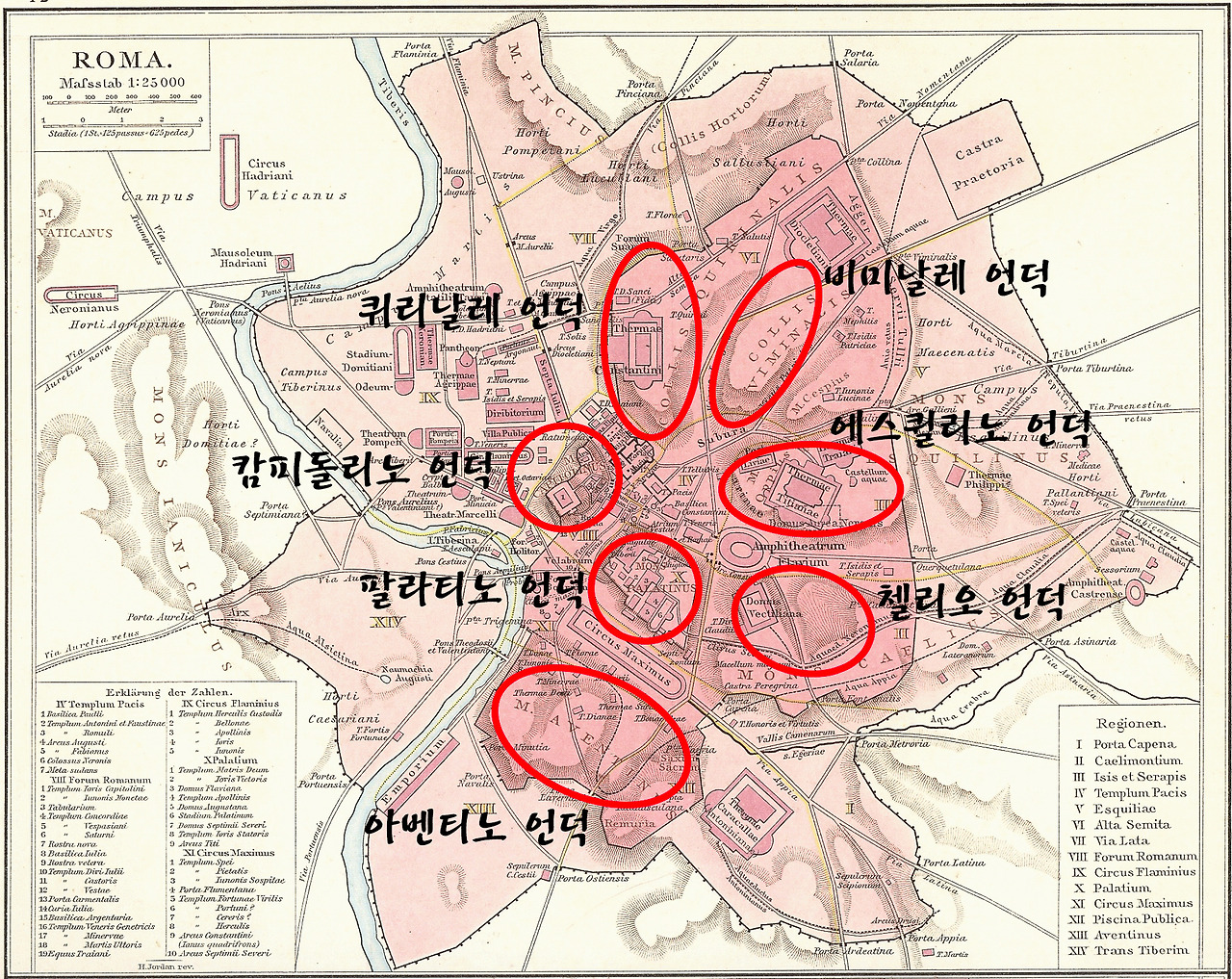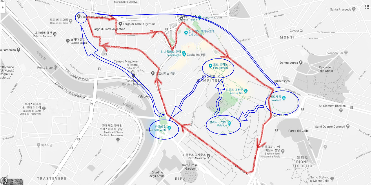 로마의 7 언덕이 어딘지 궁금하여 찾아보니 도심에서 동남쪽이 거의 다 언덕이다. 테베레 강의 범람이 심해서 아마도 언덕을 선호했지 싶다. 언덕들 한가운데 콜로세움이 있고, 캄피돌리노 언덕은 로마 도심과 포로 로마노를 연결하는 위치에 있다. 팔라티노 언덕은 로마 왕국의 설립자 로물루스가 제일 처음 정착한 곳이고 팔라티노 언덕과 아벤티노 언덕 사이에 대전차 경기장이 보인다.