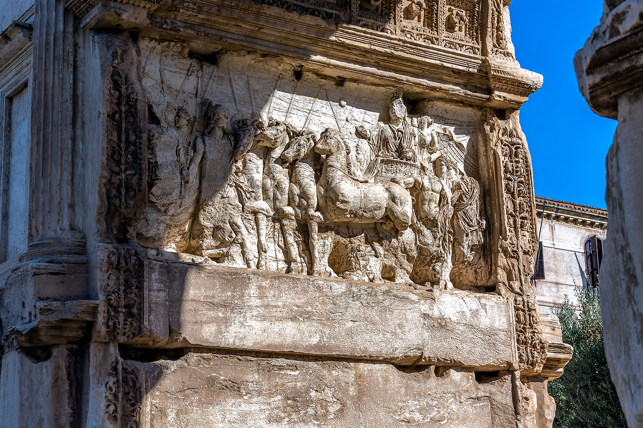 베스파시아누스 황제가 콜로세움 공사를 할 수 있도록 전쟁을 통해 재정적 뒷받침을 확보한 그의 아들 티투스 황제의 개선문. 그는 고대 유대 왕국을 정복하고 수많은 전리품을 챙기고 귀국한다. 그 당시만 해도 갈리아 지방(프랑스, 독일, 벨기에, 네덜란드 등 포함)보다 그리스 동쪽 지방의 살림살이가 좋아서 많은 지휘관들이 갈리아 지역을 기피하고 동방원정을 선호하였다. 알렉산더 대왕이 자꾸 동쪽으로 간 까닭이 거기에 있었다.