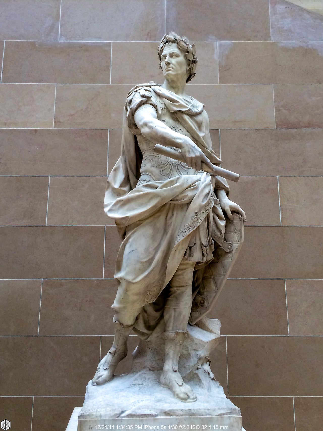 콜로세움 가는 도중 포로 로마노가 보이는 곳에 서 있는 카이사르 동상. 뒤로는 포로 로마노의 카이사르 포룸이 보인다. 원로원과 로마 시민을 의미하는 SPQR은 카이사르의 동상 아래 자리함으로써 로마 제국 번영의 시작은 카이사르였지만 그가 밟았던 땅은 원로원과 로마 시민이었음을 강조하고 있다.