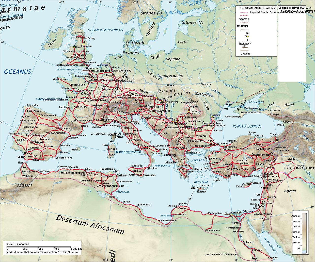하드리아누스 황제 시기 (서기 117~138년)의 로마 메인 도로 현황 (main Roman roads)