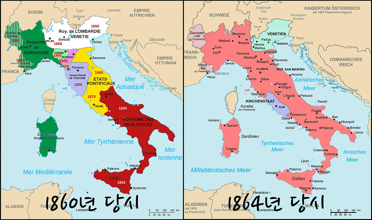 가리발디 장군이 1860년에 나폴리와 시칠리아를 점령하고 (빨간색 표시) 북부의 대부분을 통일한 샤르데냐 왕국의 비토리아 에마누엘레 2세에게 자신의 점령지를 양도한다. 1866년에 베네치아 공화국을 흡수하고 1870년 로마 교황령을 흡수하면서 이탈리아는 통일을 완성한다. 1500년간 유럽을 호령했던 로마제국은 어딜 가고 이탈리아 반도 하나 통일하는데 그렇게 힘이 들었다니 이 또한 역사의 아이러니.