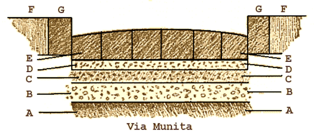 A는 맨땅 B는 주먹만 한 돌 C는 그보다 조금 작은 돌 D는 모래 그리고 E는 위에 사진에서 보이는 여러 가지 모양의 납작한 돌 딱지. 결국은 바퀴의 충격을 아래로 내려보내서 뒤집어져 올라오는 힘을 분산시켜서 아예 없애버리는 구조. 원래 갈라져 있으니 비가 와서 땅이 갈라질 일도 없다. 원리는 간단한데 결과는 대단하다. 도로 공사하고 나서 100년은 까딱없을 거라고 했다는데 1000년이 지나도 말짱하다.