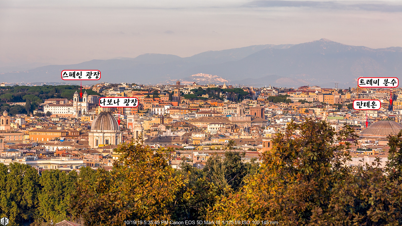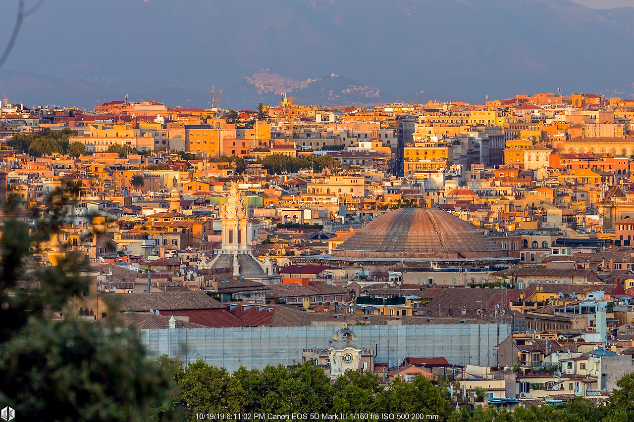 어느 행성의 우주인이 타고 온 듯한 판테온 지붕에는 어느새 언덕의 그림자가 드리웠고 그 옆으로 첨탑 부위에 바벨탑의 흔적을 살포시 간직한 보로미니의 사피엔자 성당 돔이 발사대에 대기 중인 로켓처럼 붉게 달아오르고 있다.