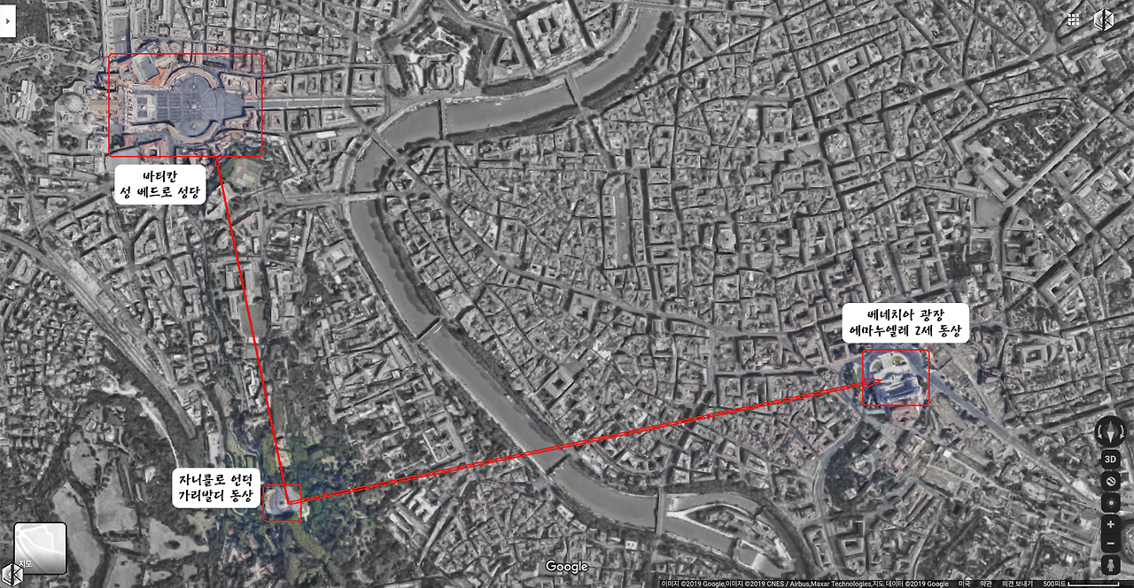 베네치아 광장과 성 베드로 성당은 자니콜로 언덕을 중심으로 마치 일부러 그렇게 설계라도 한 듯 정확히 90도의 각도를 이루고 있다. 그러니 바티칸을 바라보려면 목이 돌아갈 지경. 더구나 가리발디는 프리메이슨 회원이었기에 바티칸을 저런 표정으로 바라볼 이유가 없다.