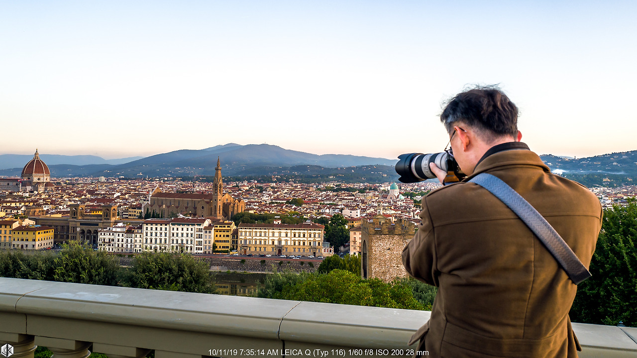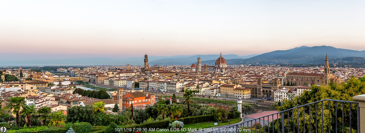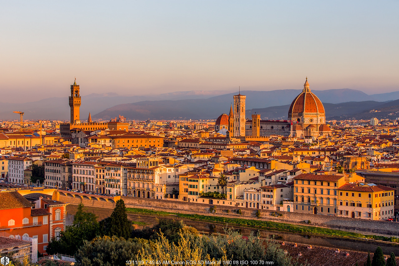 산타마리아 델 피오레 성당과 조토의 종탑이 아침햇살에 발그레하다. 그 왼쪽으로 베키오 궁이 보인다. 건물마다 반사되는 각도에 따라 빛의 발색을 달리하여 보여주는 매직 아워의 진수.