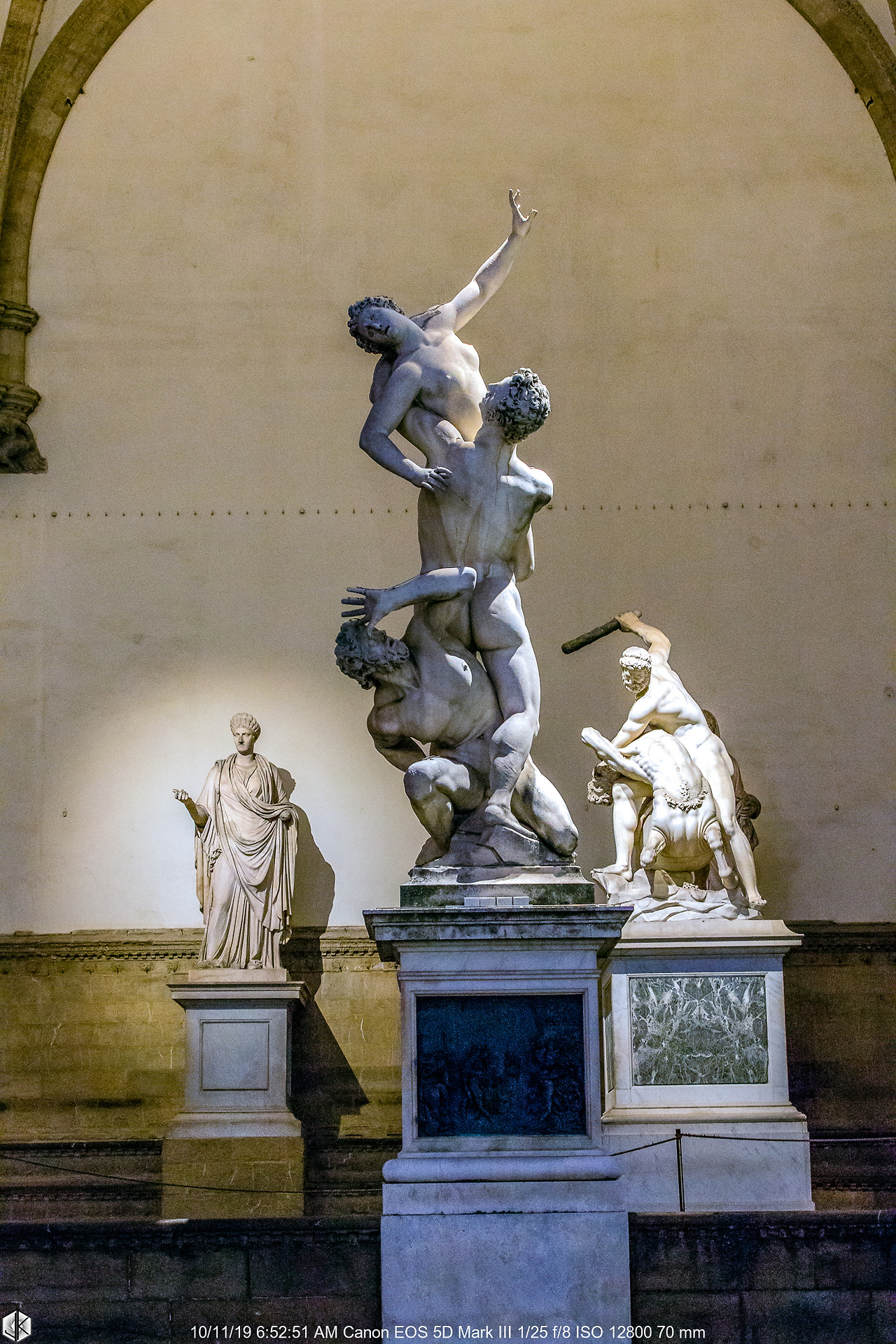 오른편의 헤라클레스도 최초 미켈란젤로에게 의뢰하여 다비드와 나란히 전시하려고 하였으나 제작 일정이 여의치 않아 비치오 반디넬리에게 기회가 주어진 것인데, 재미있는 것은 반디넬리는 다빈치 지지자로 미켈란젤로의 <카시나 전투>를 혹평함으로써 미켈란젤로가 가장 싫어하는 후배 조각가가 되는데 그 두 사람의 작품이 나란히 전시되어 있는 것 또한 얄궂은 운명의 장난.