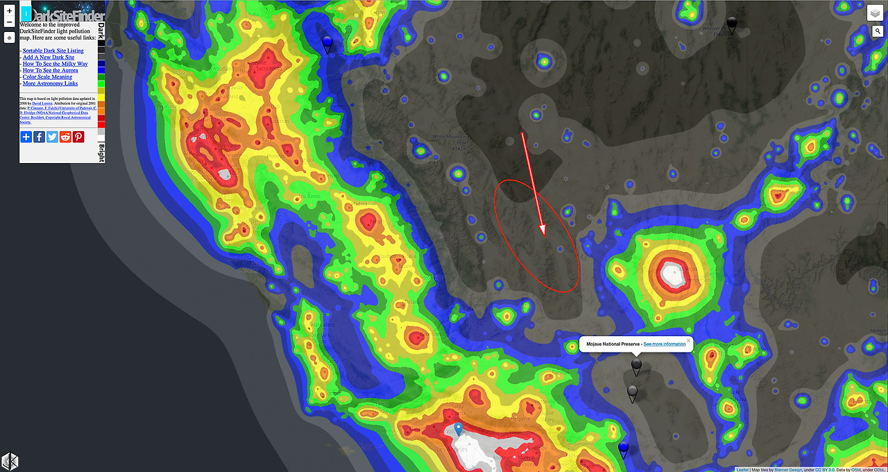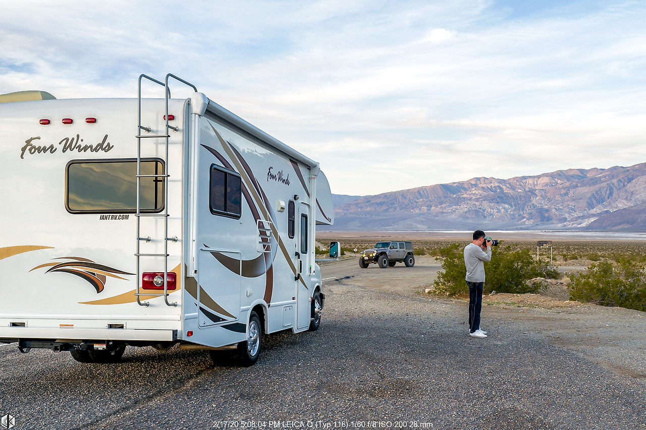 오후 1시 30분 즈음 집을 나서며 6시 전 도착이 가능할 줄 알았는데 처음부터 계산 착오. 구글맵 시간 계산 평균 시속은 65마일. 하지만 RV 평균 시속은 50마일 정도. 그러니까 RV 소요시간은 곱하기 1.3을 해야 한다. 3시간 30분 정도를 쉬지 않고 달려서 전망대에 도착하니 저 산너머가 데스밸리라고 구글이 알려준다. 그래서 거의 다 온 줄 알았지만 그때부터 가로등도 없고 오가는 차도 없는 칠흑같이 어두운 밤길을 2시간을 달려야 했다. 산은 높고 땅은 낮은 지역이라 항해박명, 천문박명 이런 거 없다. 그냥 바로 어둠이 들이닥친다. 별 사진 찍기에는 더없이 좋겠지만 중간에 무슨 문제라도 생기면 난감한 곳이기도 하다. 전화 통화가 되지 않기 때문이며 데스밸리 안에 있는 마을에 도착해야 겨우 통화를 할 수 있는 시그널을 구경할 수 있다.