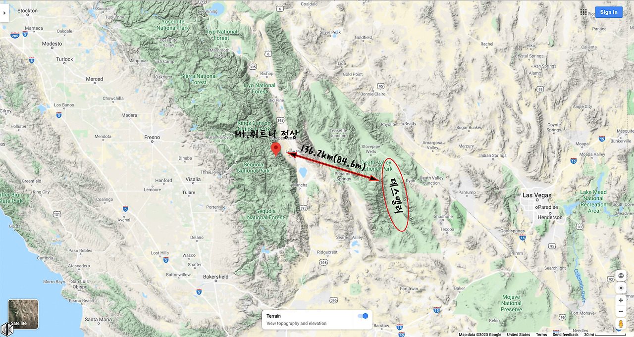 미국 본토 (알래스카와 하와이 제외) 최고의 고산준령 시에라 네바다 산맥의 가장 높은 봉우리 휘트니산에서 불과 136킬로 떨어진 곳에 북미 대륙에서 가장 해발 고도가 낮은 곳이자 가장 뜨거운 곳이 있다. 극과 극은 통한다고 하더니 가장 밝은 은하수 중심 바로 옆에 블랙홀이 있는 이치와 별반 다르지 않을 듯하다.