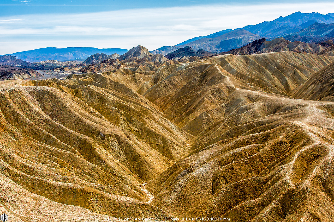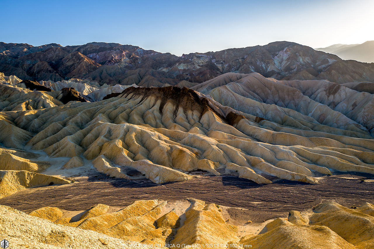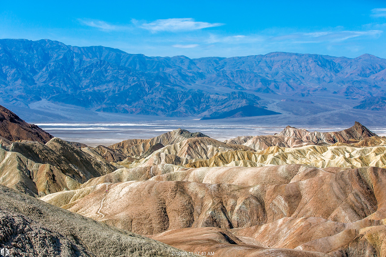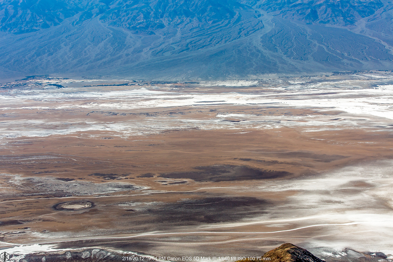 눈 앞에 보이는 해저 융기 지형 너머로 보이는 넓디넓은 벌판이 데스밸리 되시겠다. 사진 왼쪽으로 보이는 길을 따라 내려가면 스타워즈 촬영지 골든 캐년으로 이어진다. 유명한 운동선수가 물병 하나 달랑 들고 내려갔다가 불귀의 객이 된 이후로 여름철엔 1 갤론(3.8리터)의 물을 지니고 들어가라는 경고문이 세워진다. 얼마 되지 않아 보인다고 얕잡아 보면 큰일 난다. 명색(名色)이 데스밸리다.