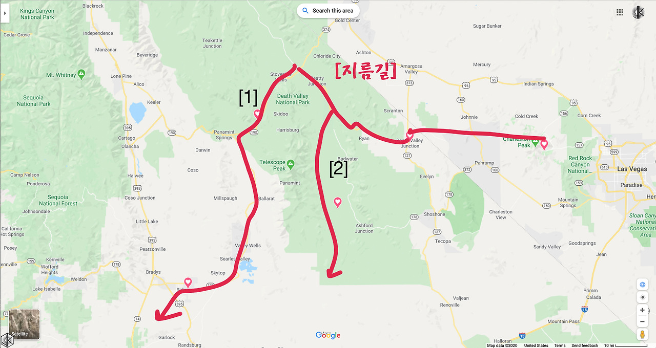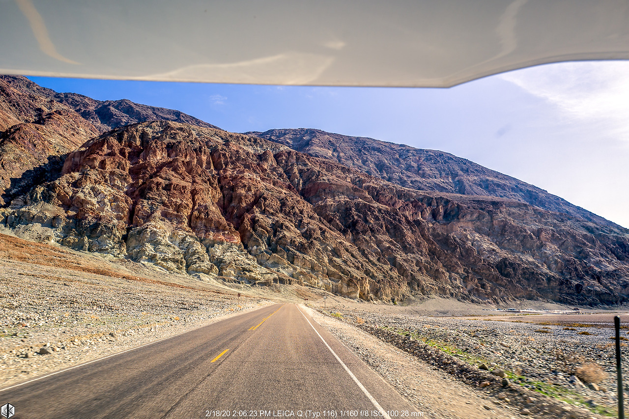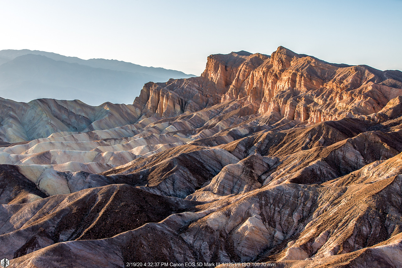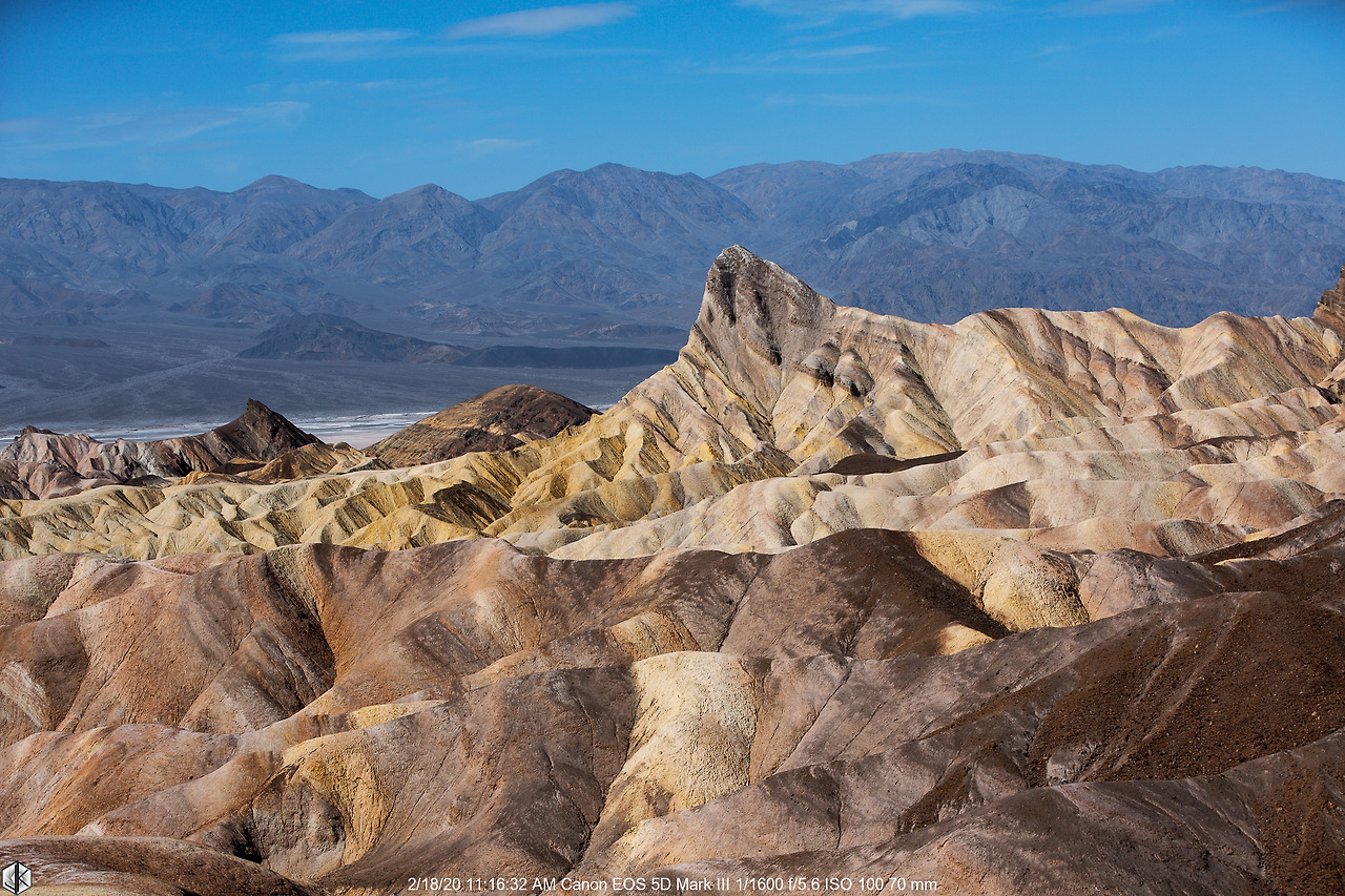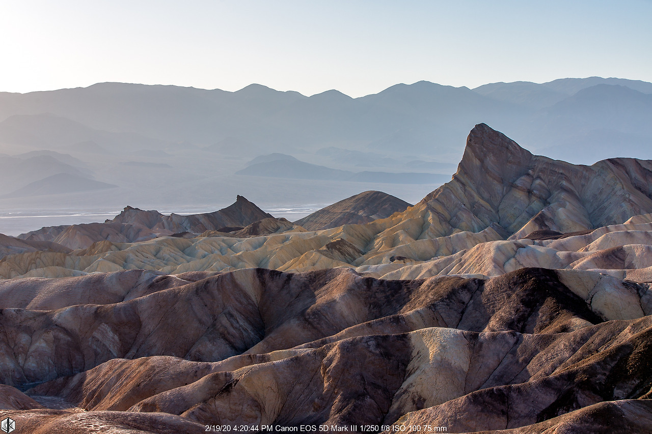 눈 앞에 보이는 해저 융기 지형 너머로 보이는 넓디넓은 벌판이 데스밸리 되시겠다. 사진 왼쪽으로 보이는 길을 따라 내려가면 스타워즈 촬영지 골든 캐년으로 이어진다. 유명한 운동선수가 물병 하나 달랑 들고 내려갔다가 불귀의 객이 된 이후로 여름철엔 1 갤론(3.8리터)의 물을 지니고 들어가라는 경고문이 세워진다. 얼마 되지 않아 보인다고 얕잡아 보면 큰일 난다. 명색(名色)이 데스밸리다.