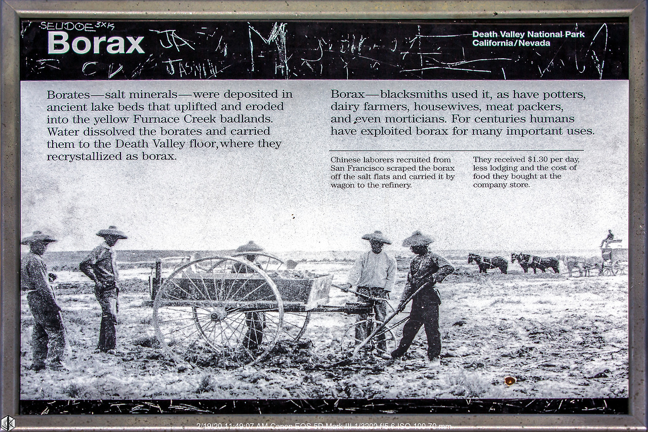 당시 이 곳에서 일했던 노동자들이 멕시코인들이 아니라 중국인들이었다는 것이 놀랍다. 보락스 컴퍼니가 운영을 시작한 것이 1872년. 황금을 찾아 이민 온 중국인들이 샌프란시스코에 와보니 금을 캘 곳은 없고 딱히 할 일도 없고 먹고살자면 뭐라도 해야 하는 절박한 상황이었다. 하루 일당 1불 30전을 받고 거기서 숙박비와 식비를 공제한다. 1890년의 $1이면 2020년 $29불 수준. 그러니 하루 $37.7불을 받고 일을 한 것인데 물가 상승을 고려하더라도 많아 보이지는 않는다.