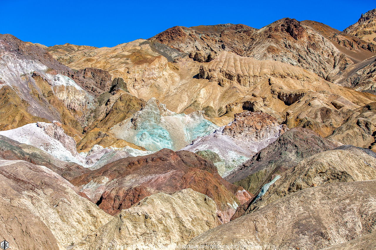 아티스트 드라이브를 따라 올라가면 정면으로 보이는 각양각색의 바위 언덕. 배스킨라빈스 아이스크림을 퍼다 놓은 듯한 색상인데 각종 암석의 산화작용의 결과물이다.